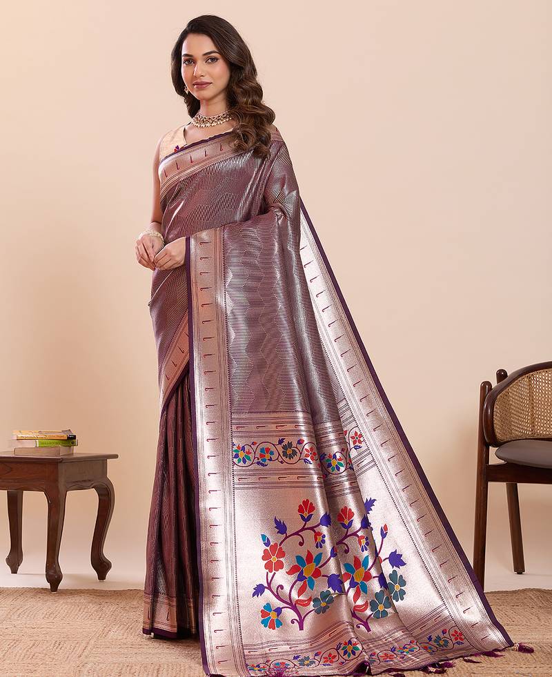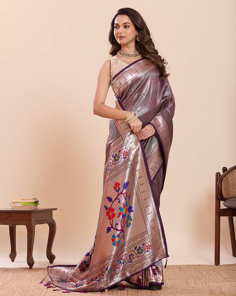 Wine floral print pure soft silk paithani saree with blouse