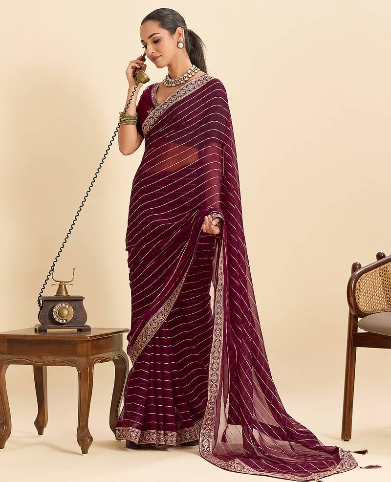 Wine striped, sequence georgette bollywood saree with blouse