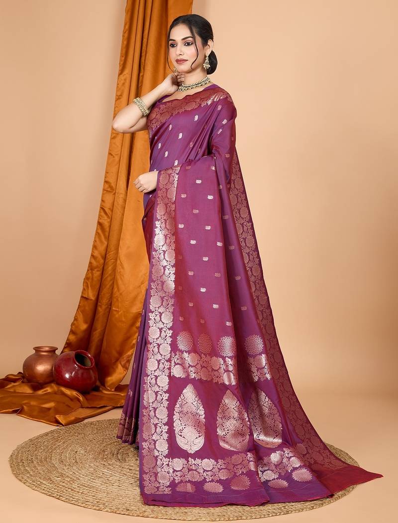 Wine woven self design embellished pure silk banarasi saree with blouse