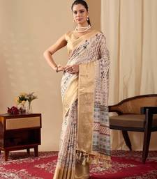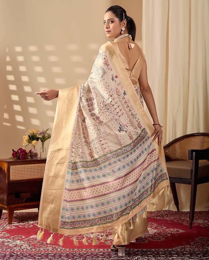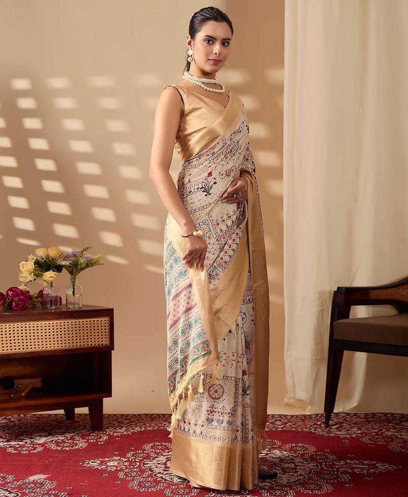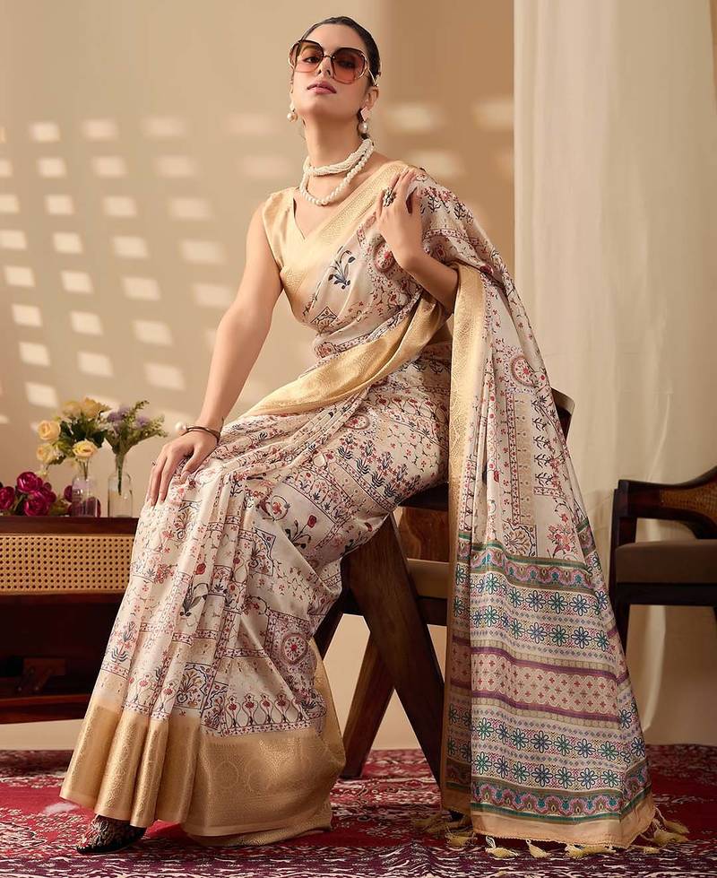Beige printed soft lichi art silk saree with zari woven border | traditional festival wear saree with contrast blouse