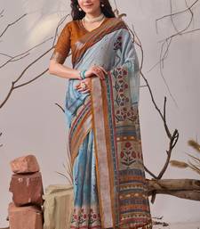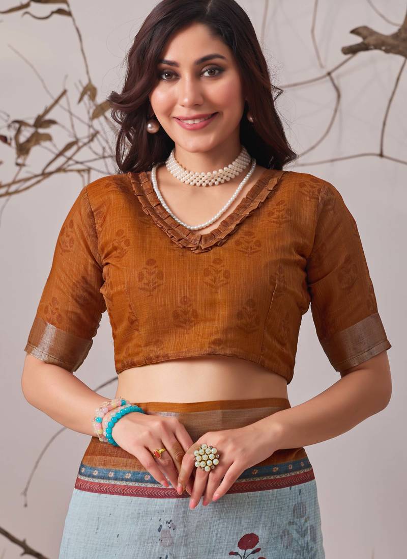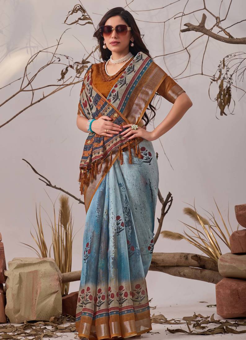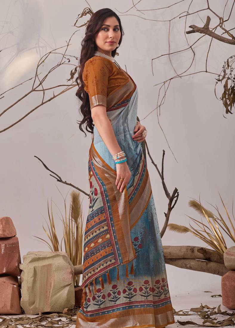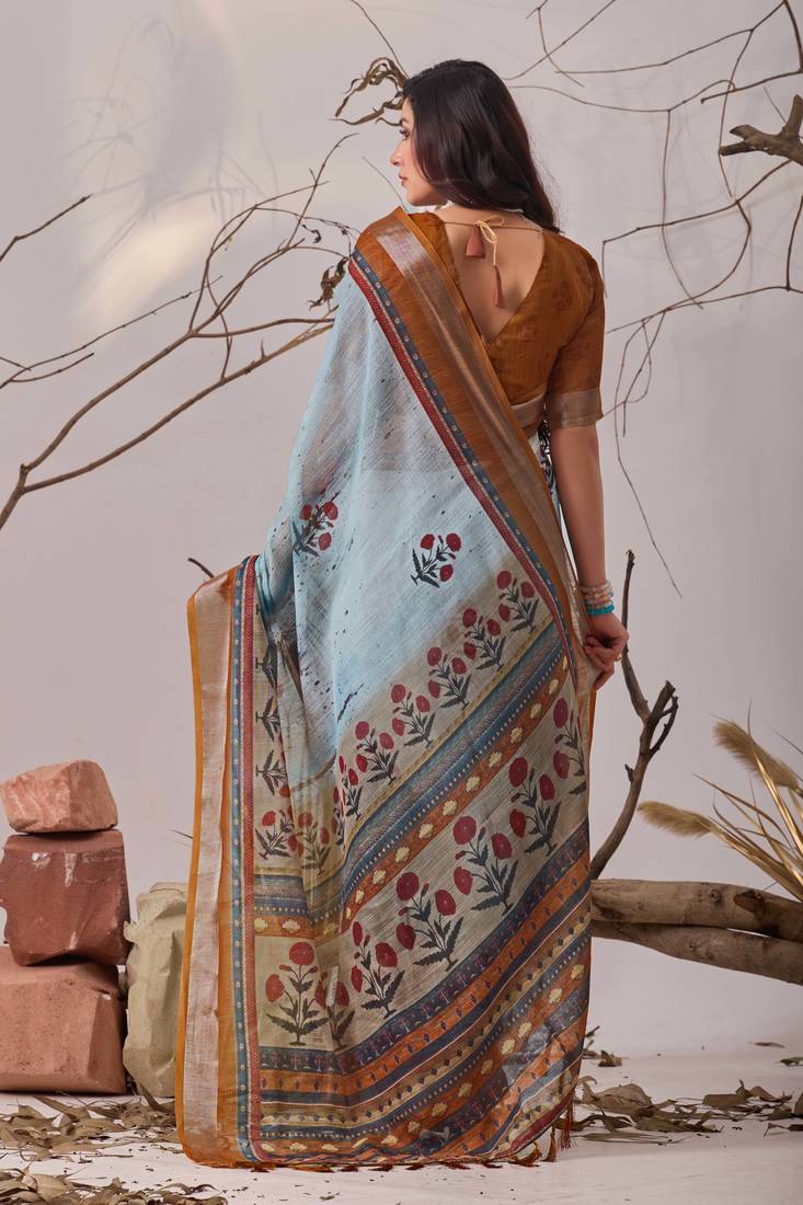 | Product Name | Blue Digital Printed Linen Cotton Floral Saree With Blouse – Designer Festive Wear | |