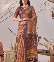 Bronze elegant digital printed linen cotton floral saree with designer pallu – party wear saree with blouse