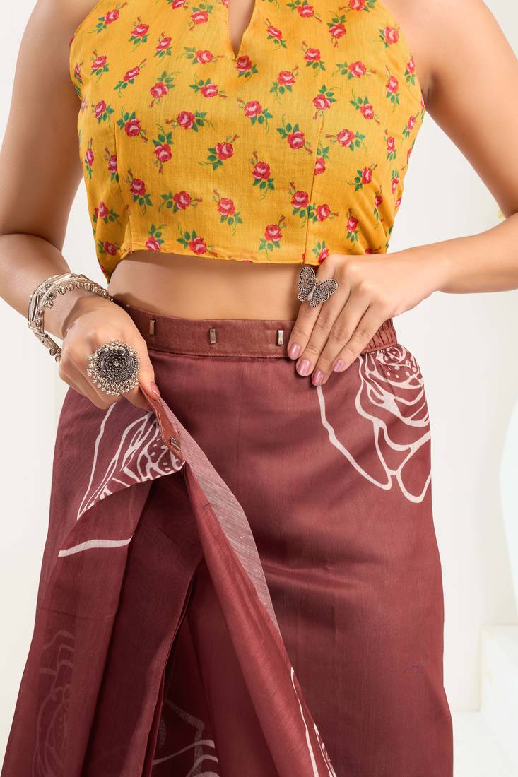 | Product Name | Brown Lightweight Linen Blend Ready To Wear Saree With Printed Work & Zari Border – One Minute Saree | |