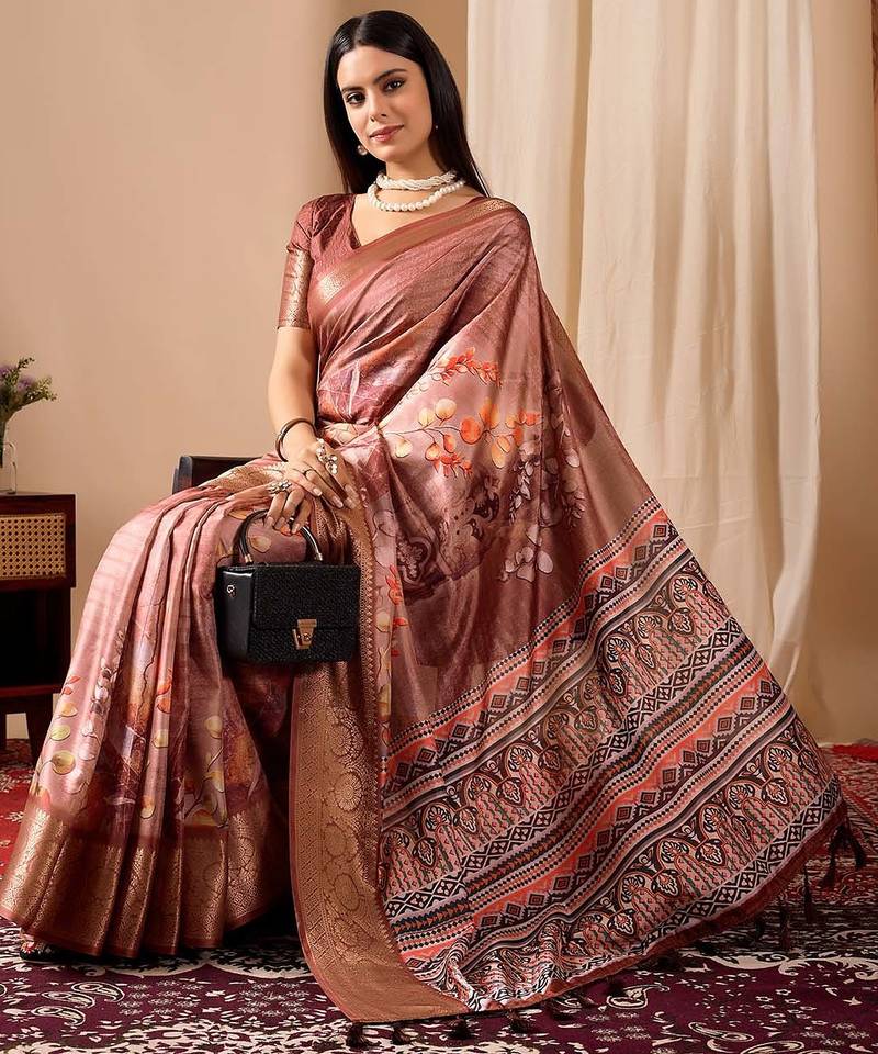 Dusty rose soft lichi art silk printed saree with patola motifs & woven border | traditional patola saree with blouse