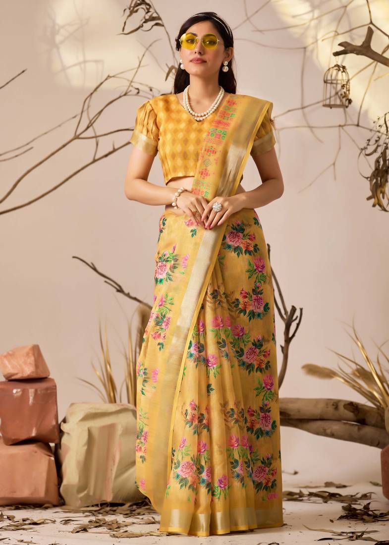 Golden yellow floral print linen cotton saree with patola style design & contrast border – printed saree with blouse