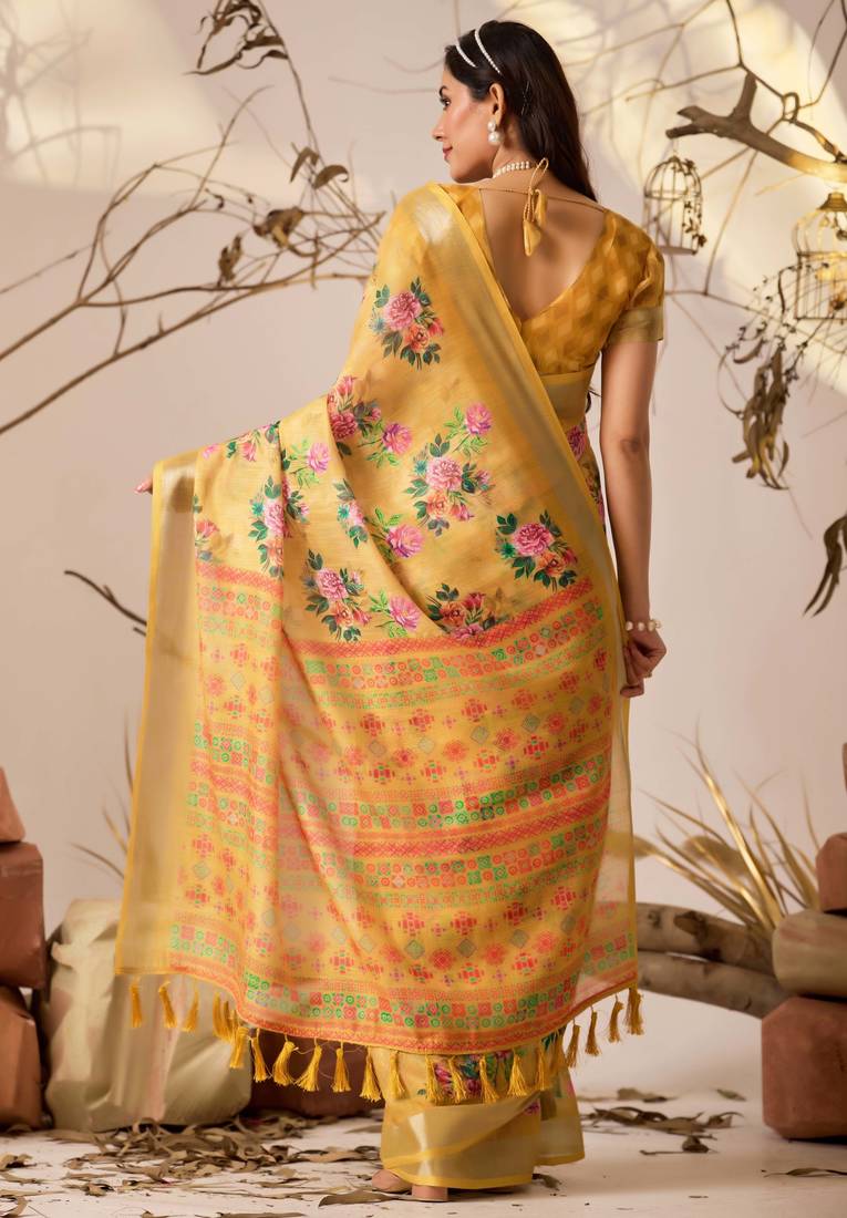 | Product Name | Golden Yellow Floral Print Linen Cotton Saree With Patola Style Design & Contrast Border – Printed Saree With Blouse | |