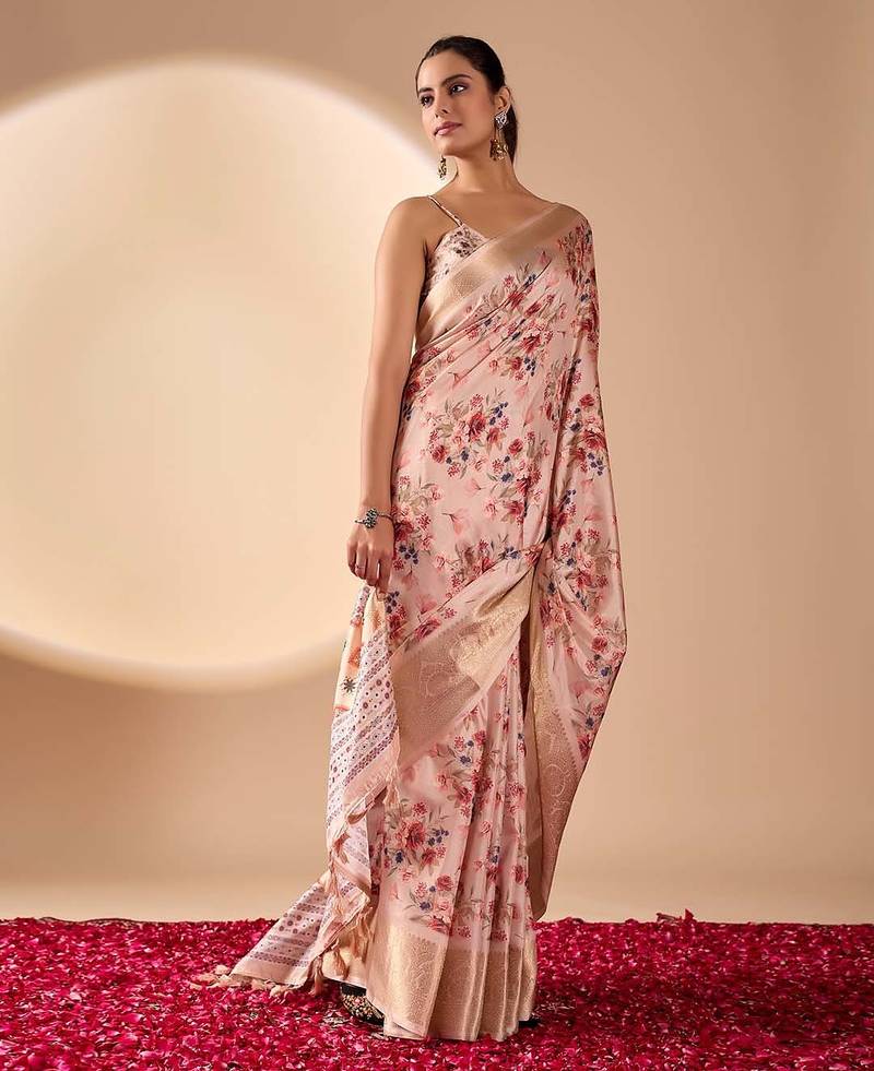 Light mauve floral printed lichi art silk zari woven traditional banarasi art silk saree with blouse