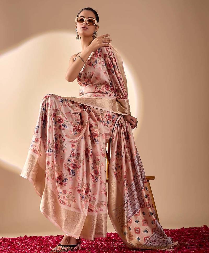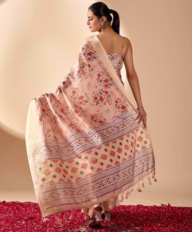 | Product Description | • Premium Soft Lichi Silk Saree With Elegant Floral Digital Weaving And Rich Zari Craftsmanship.