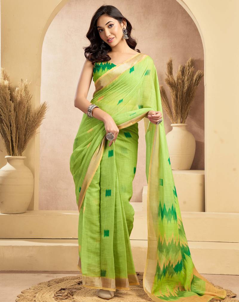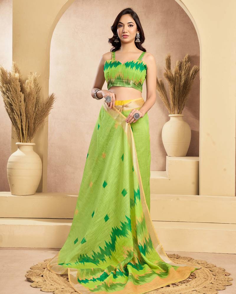 | Product Name | Lime Green Linen Ikat Printed Ready To Wear Saree | Party Wear One Minute Saree With Unstitched Blouse & Pocket | |