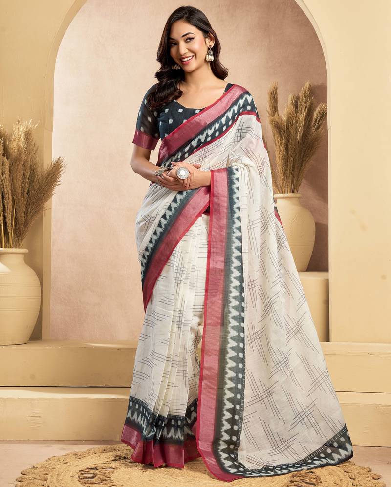 Off-white linen printed ready-to-wear saree with zari stripe border | one minute saree with blouse piece & pocket