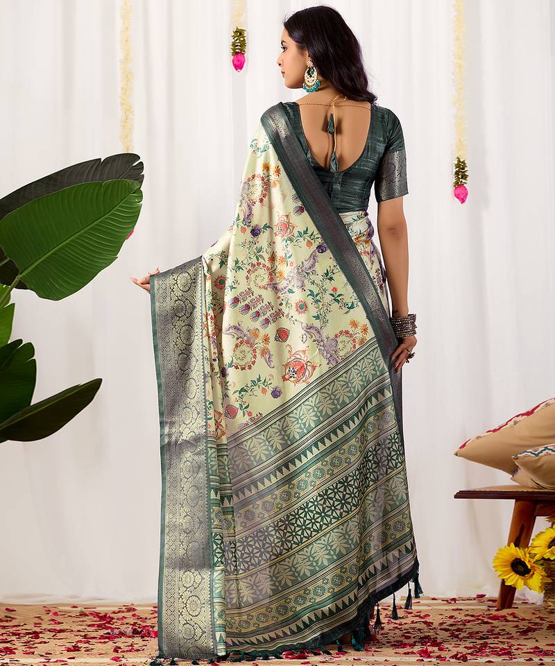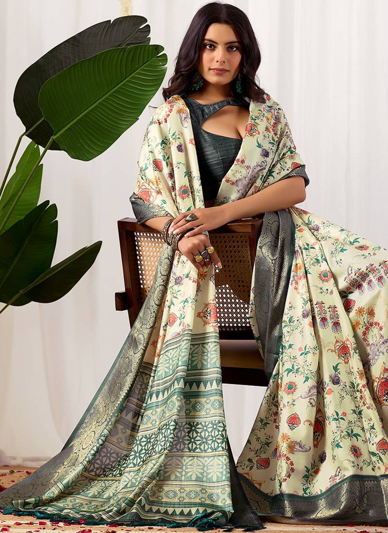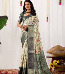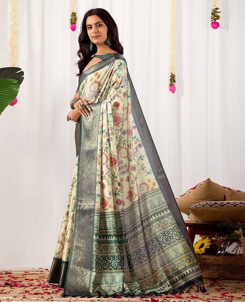 Off-white soft lichi art silk saree with digital floral print & intricate zari woven border | designer contrast blouse