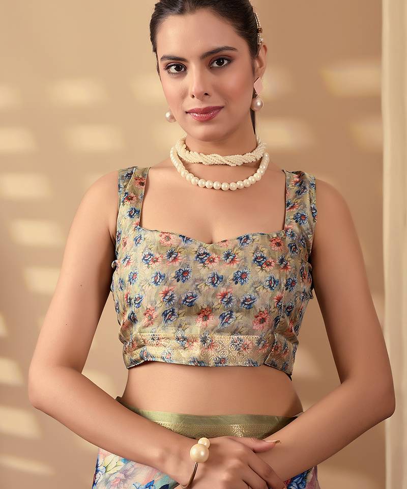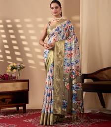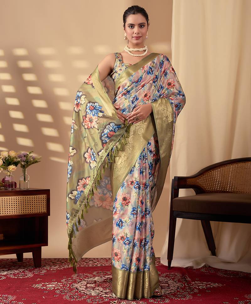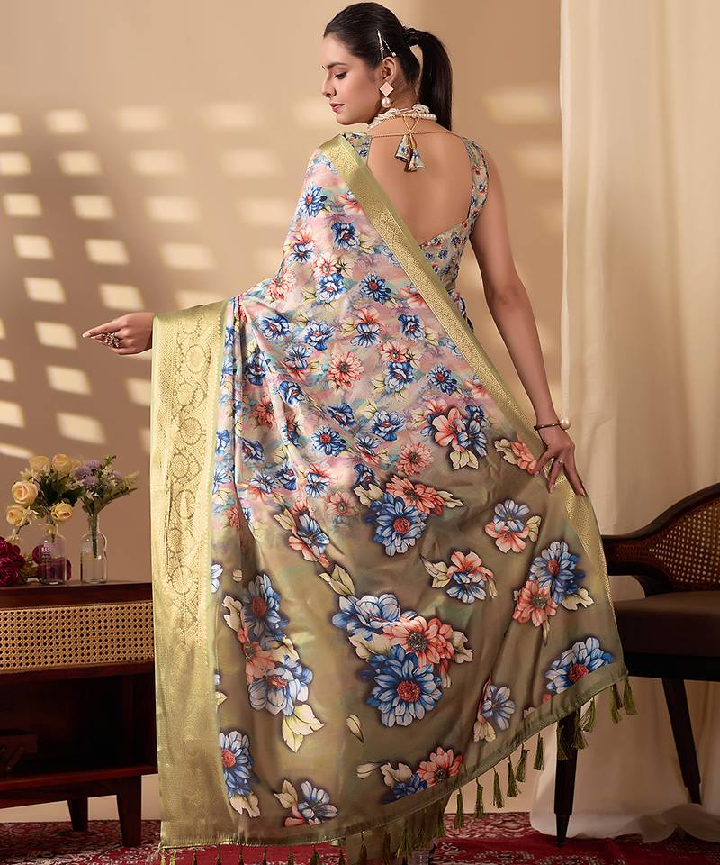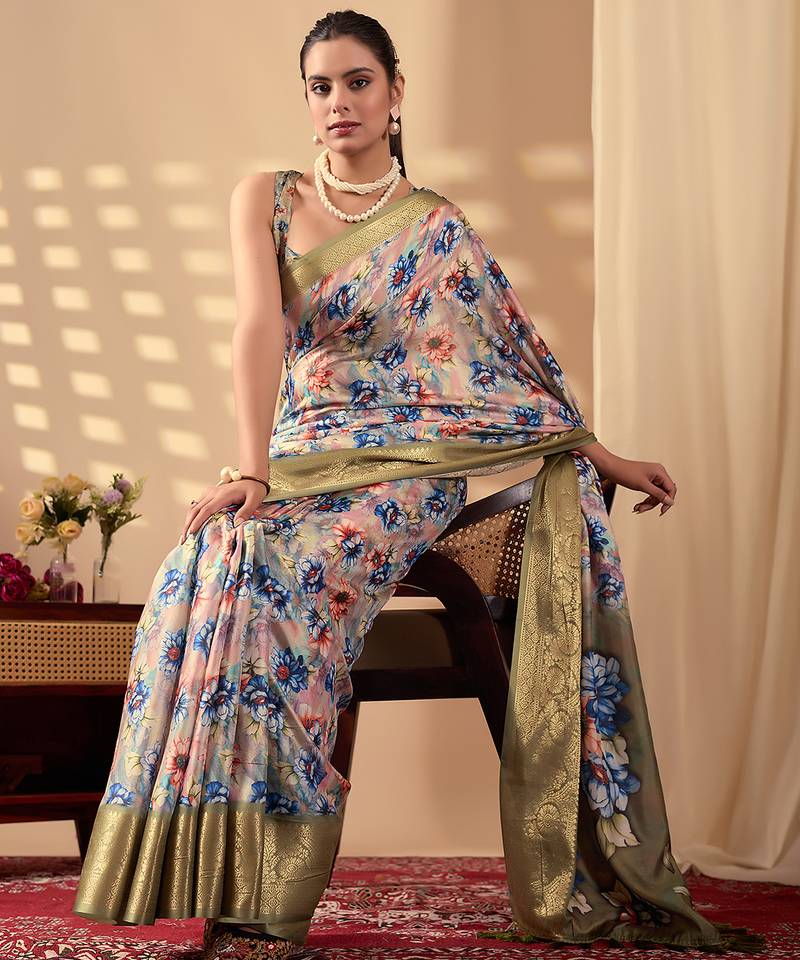 Olive soft lichi art silk floral print designer printed‐sarees with contrast blouse