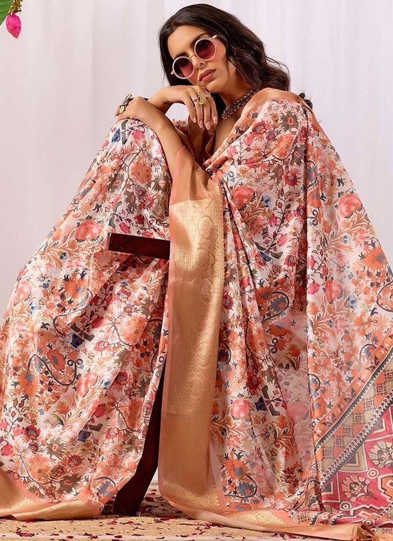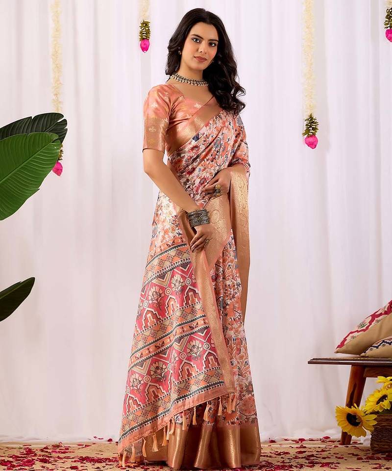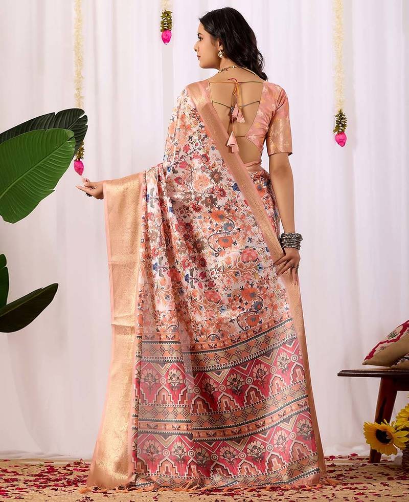 Peach elegant digital floral work soft art silk banarasi style saree with rich zari border & contrast blouse