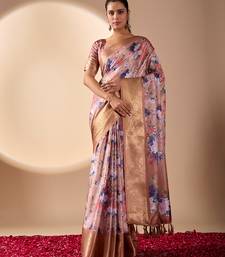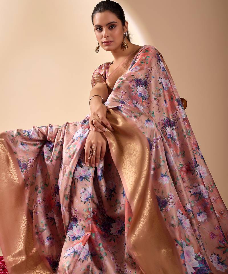Peach lichi silk digital floral print saree with rich zari pallu & contrast border – designer party saree with blouse