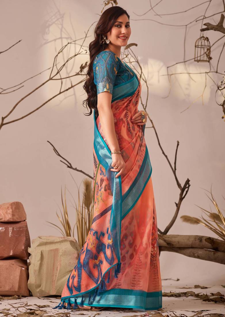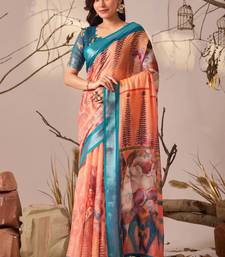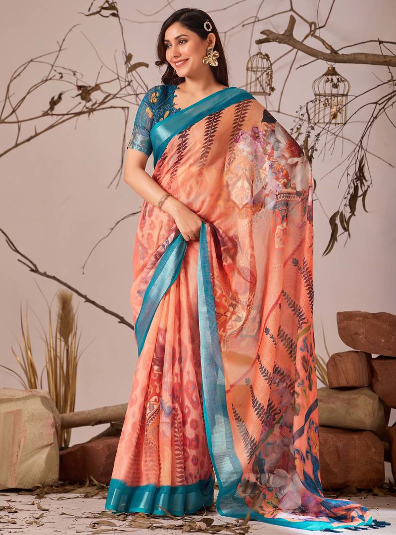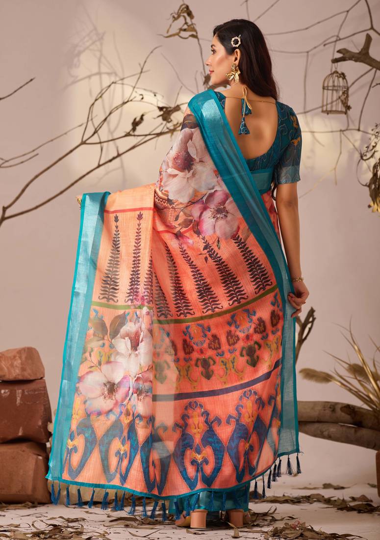 | Product Name | Peach Linen Cotton Saree With Elegant Digital Floral & Leaf Print And Patola Style Contrast Border With Matching Blouse | |