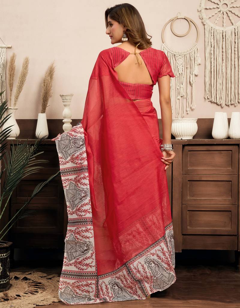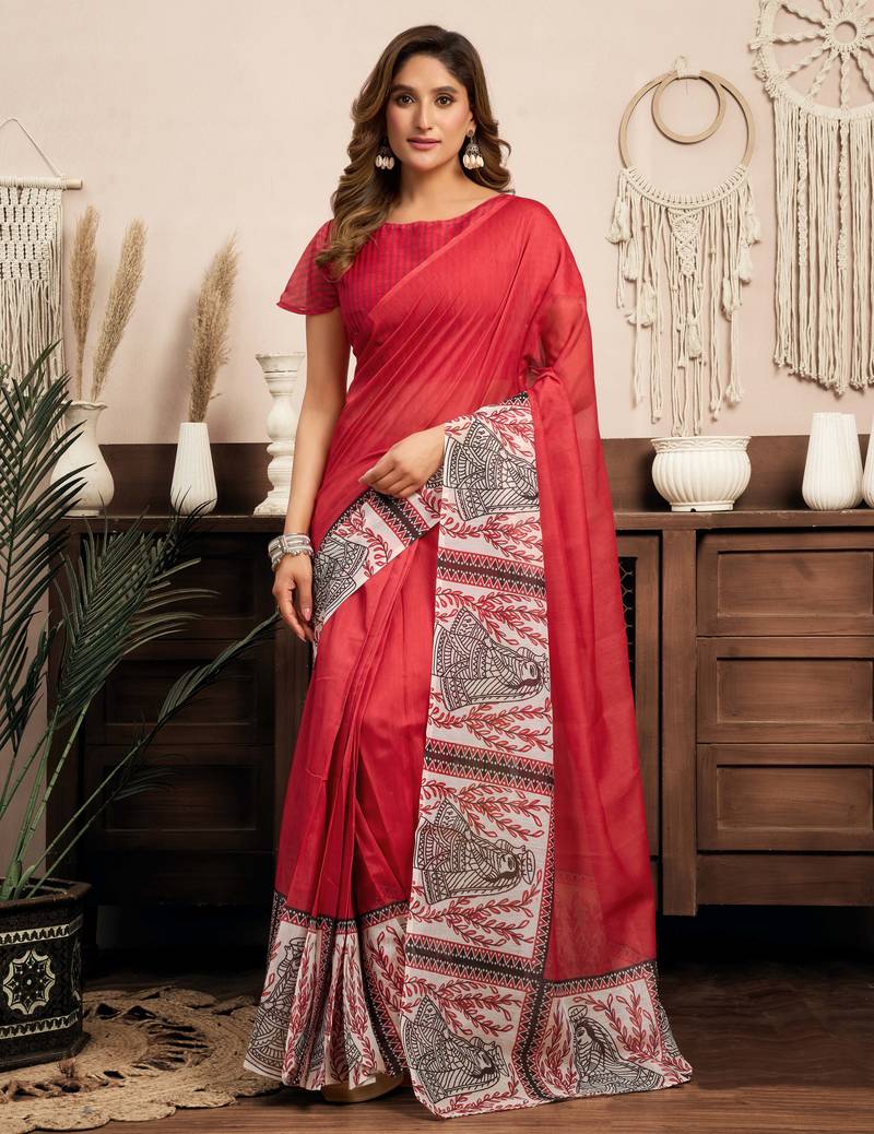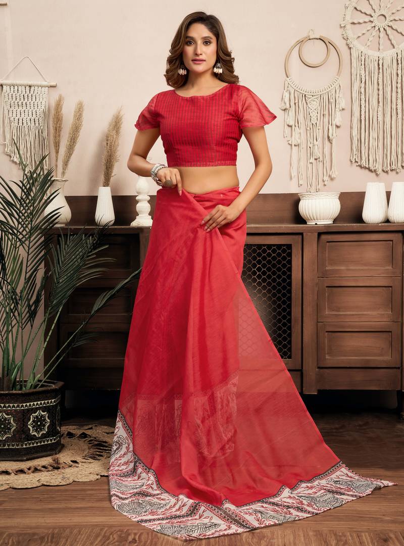 Product Name Red Ready To Wear Linen Saree With Printed Border And Contemporary One Minute Draping Style