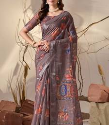 Smoky brown linen cotton digital floral print saree with patola inspired border & matching blouse