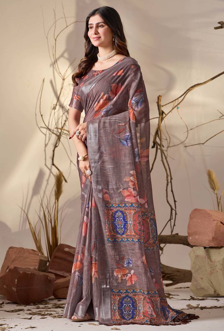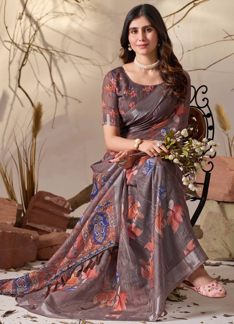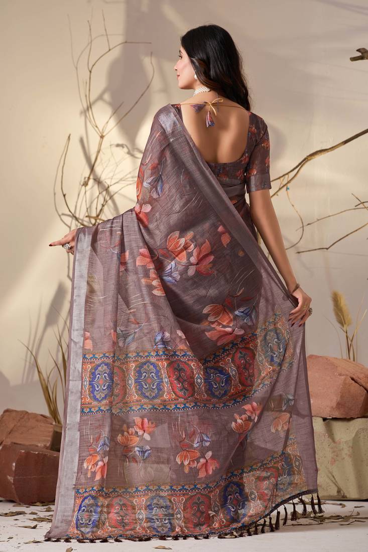 | Product Name | Smoky Brown Linen Cotton Digital Floral Print Saree With Patola Inspired Border & Matching Blouse | |