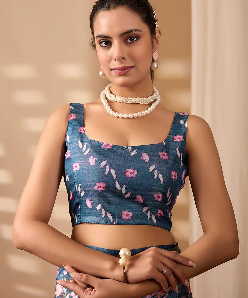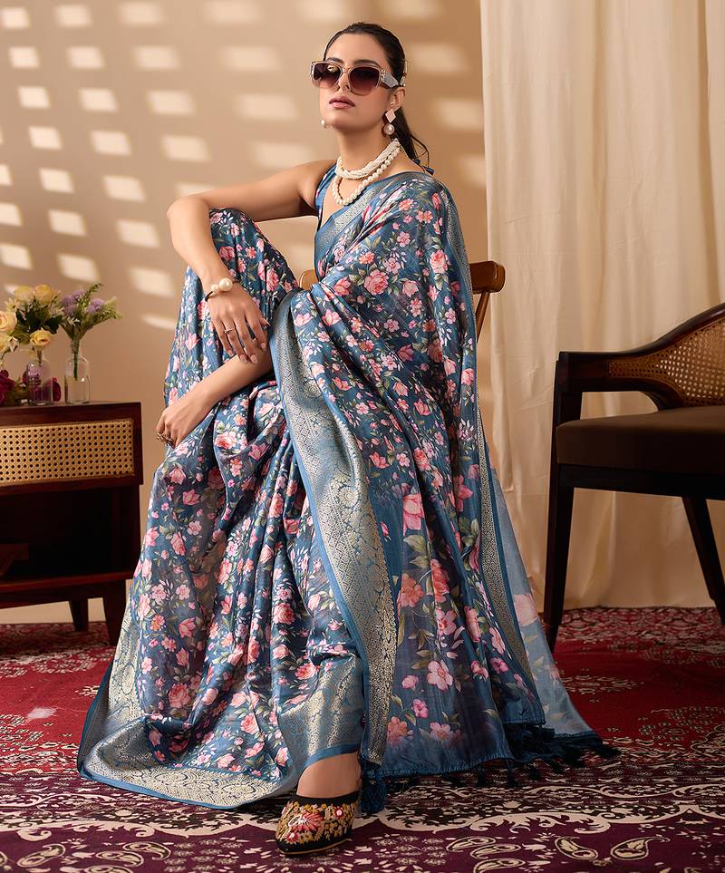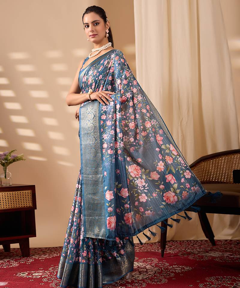 | Product Name | Teal Blue Lichi Silk Saree With Rose Floral Print & Zari Border | Designer Contrast Blouse | |