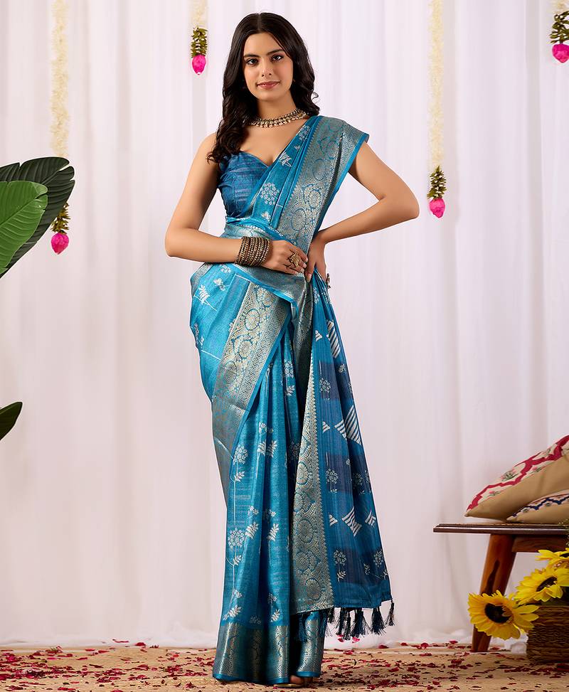 Turquoise lichi silk zari woven saree with rich traditional motifs & designer contrast blouse | festival & wedding wear