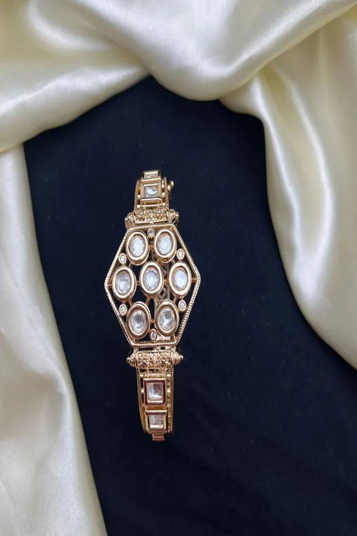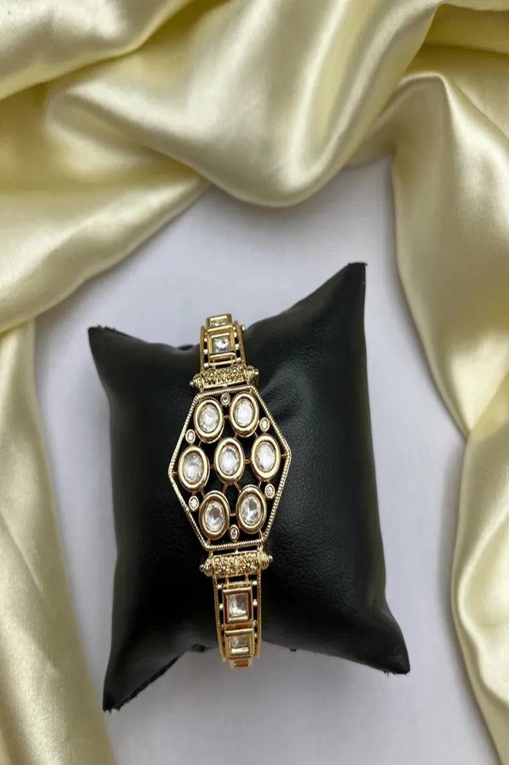 | Product Description | The Bracelet Features A Striking Central Hexagonal Motif, Beautifully Studded With Seven Round White Kundan Stones, Symbolizing Grace And Symmetry. The Intricate Gold Plated Lattice Work Band Enhances Its Royal Appeal, While The Openable Clasp Design Ensures Effortless Wear And A Comfortable Fit. |