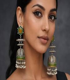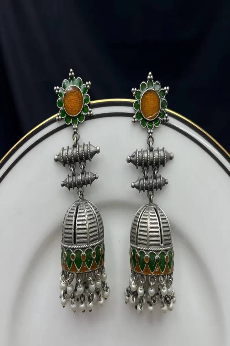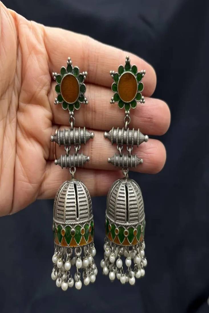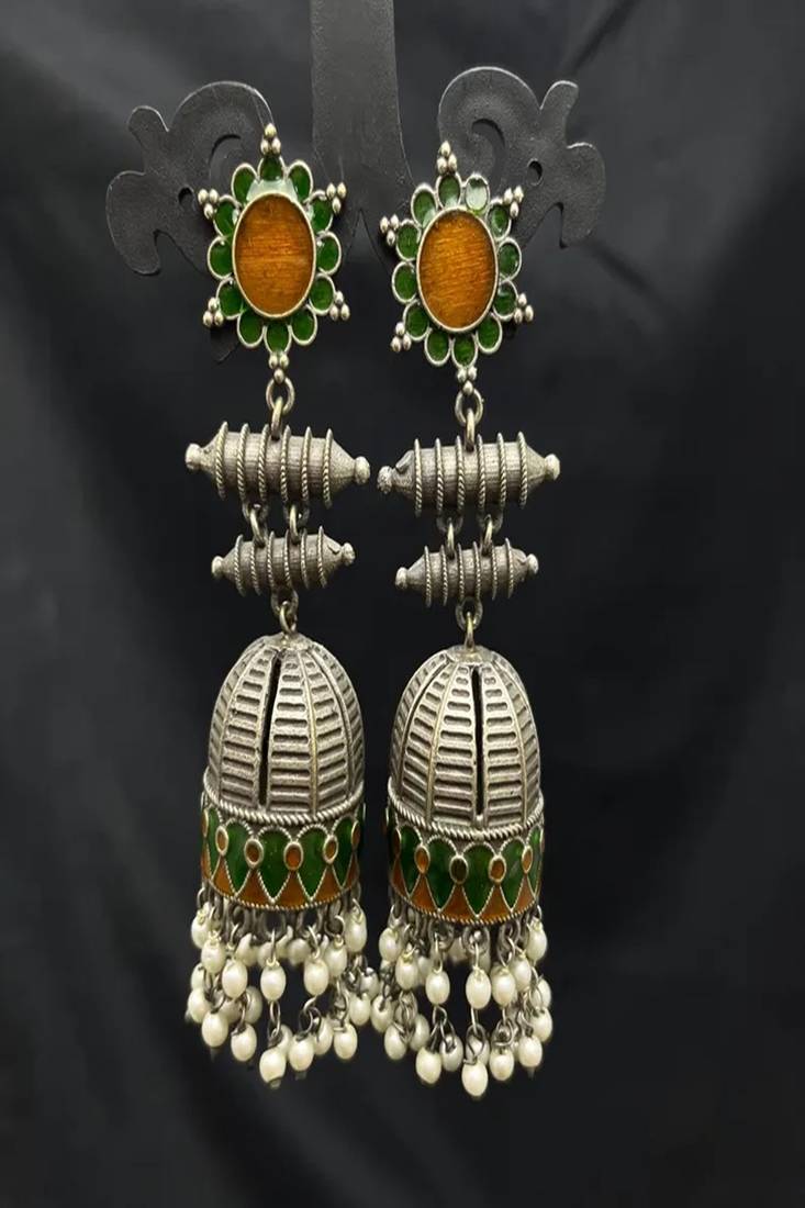 | Product Name | Handmade Meenakari Jhumka Earrings, Oxidized Silver Indian Jhumkas With Pearls, Green & Gold Enamel Boho Jewelry | |