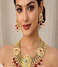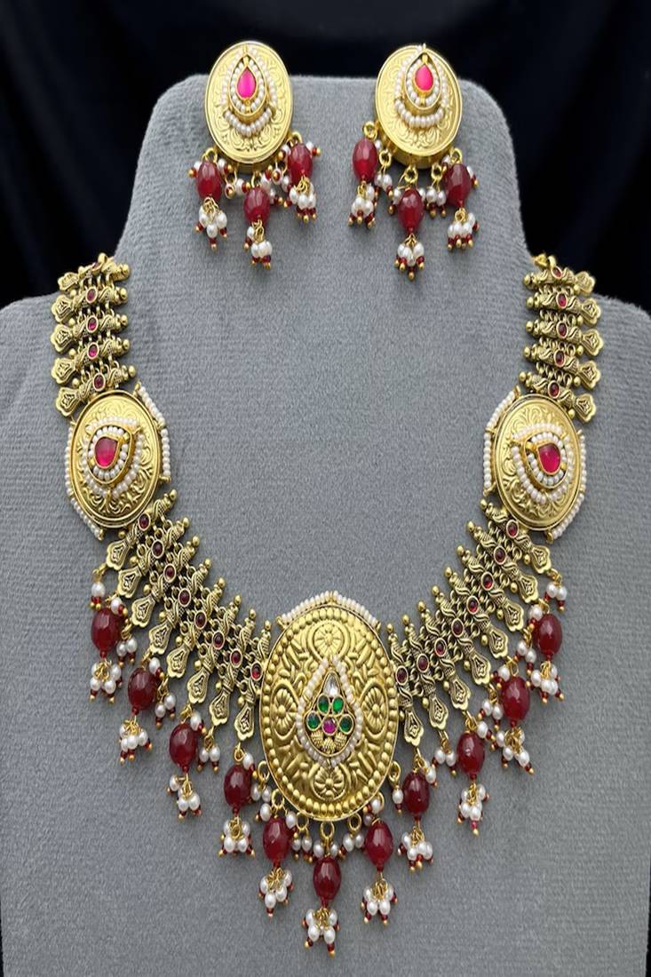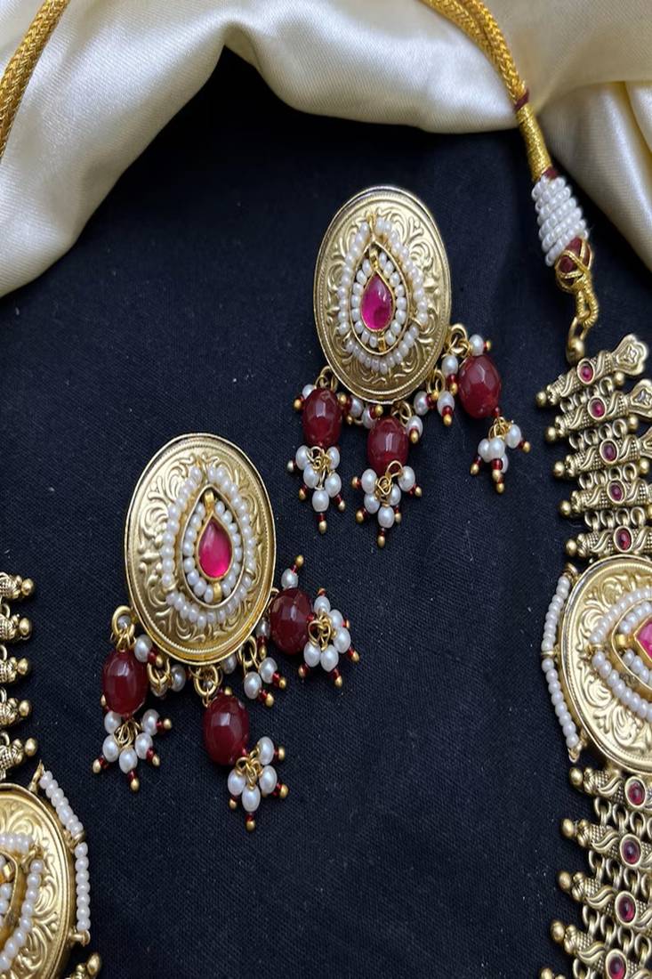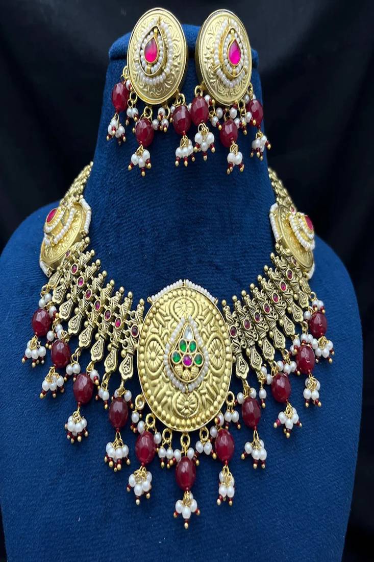 Make A Regal Statement On Your Special Day With This Traditional Kundan Jadau Jalebi Necklace Set, Inspired By Royal Rajwadi Heritage Jewelry. This Luxurious Bridal Choker Features Intricate Circular “Jalebi” Motifs, Handcrafted Detailing, And Rich Red & Green Stone Embellishments That Reflect Timeless Indian Craftsmanship.
