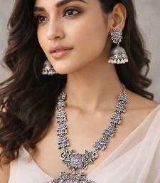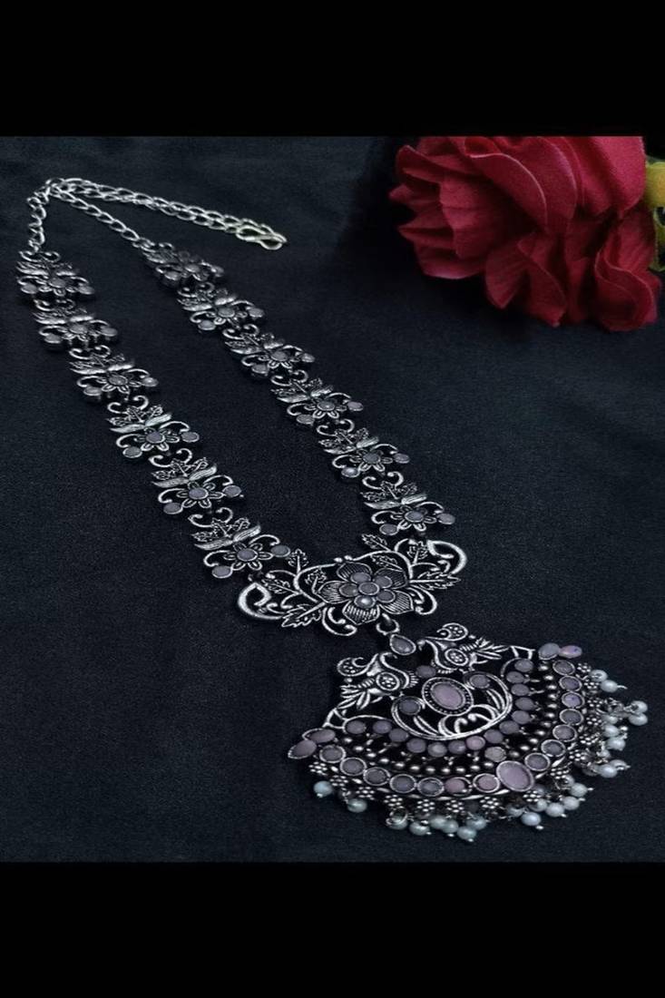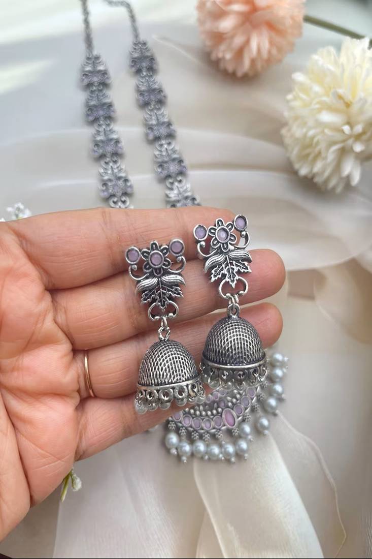 | Product Name | Oxidized Silver Long Necklace Set With Jhumka Earrings|| Pink Stone Temple Jewelry | |