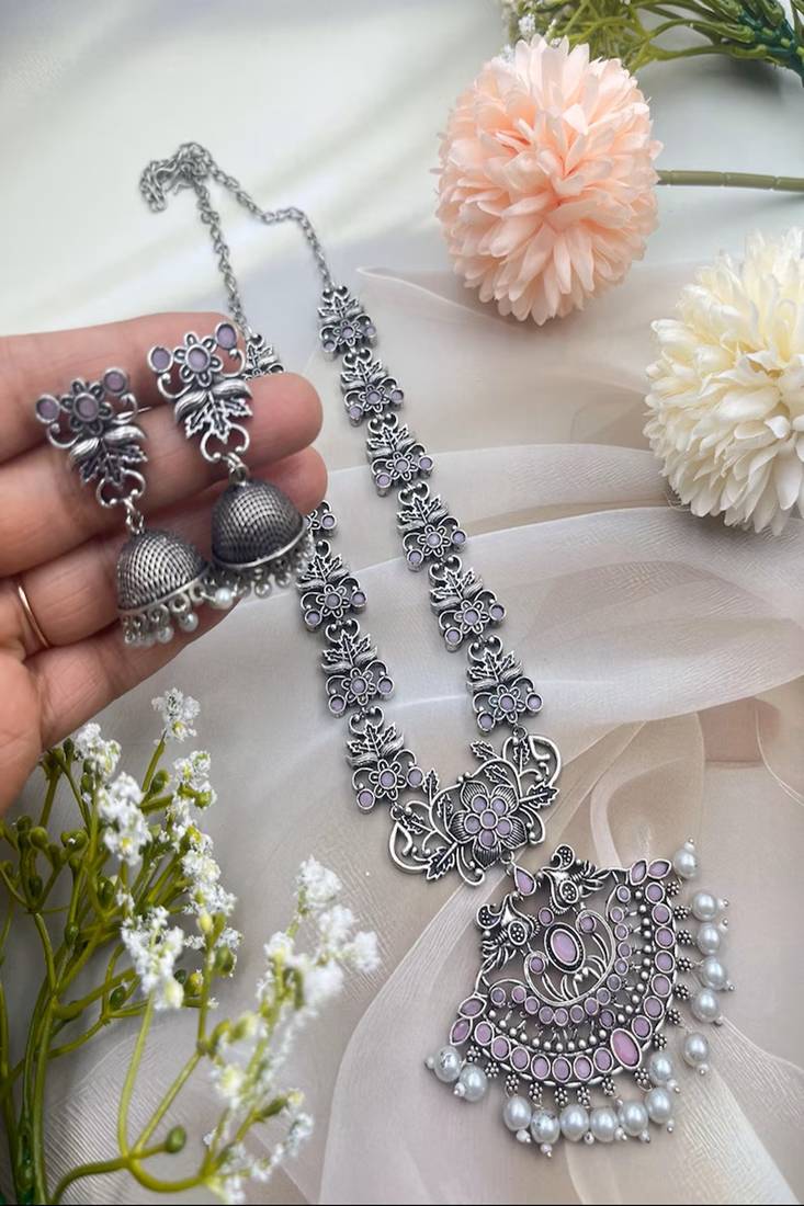 | Product Description | Oxidized Silver Long Necklace Set With Jhumka Earrings, Pink Stone Temple Jewelry, Vintage German Silver Floral Pendant, Boho Indian Statement Necklace Gift For Women