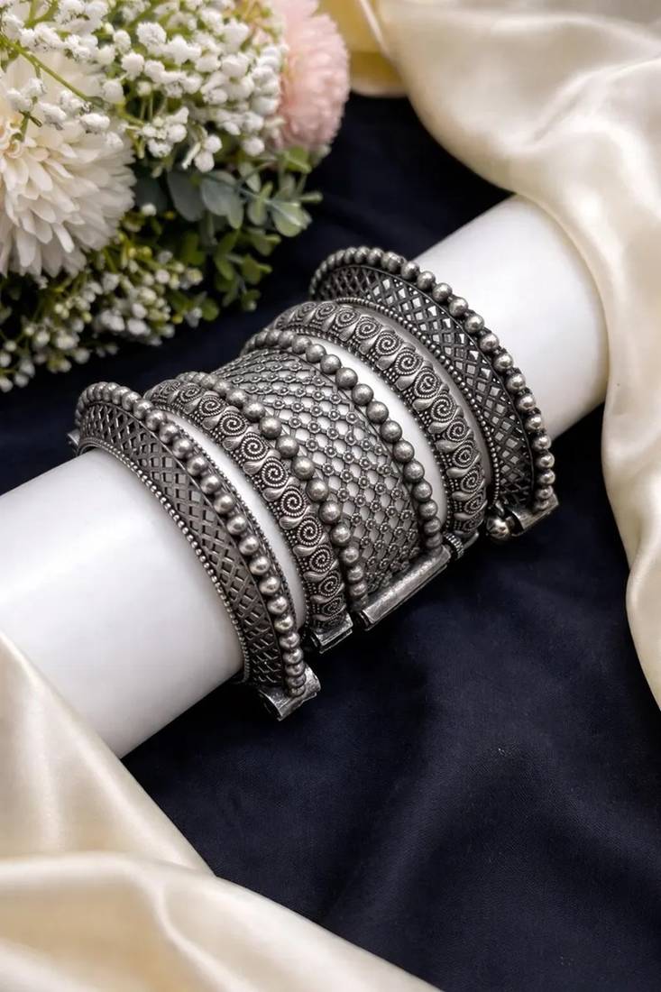 | Product Description | Make A Bold Statement With This Stunning Oxidized Silver Tribal Cuff Bracelet, Handcrafted In A Classic Indian Ethnic Style. Designed With Intricate Lattice Work, Spiral Detailing, And Layered Bead Accents, This Vintage Inspired Kada Is Perfect For Women Who Love Bold, Boho, And Heritage Jewelry. |