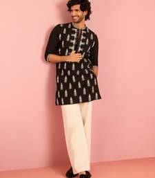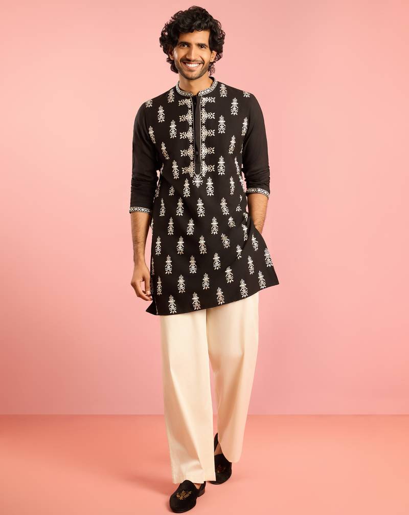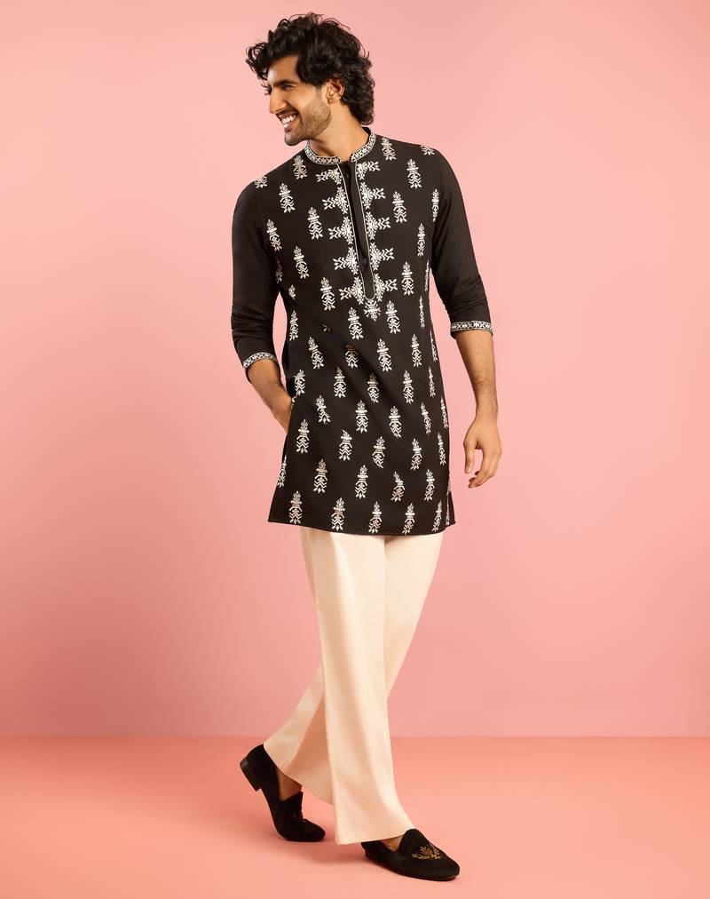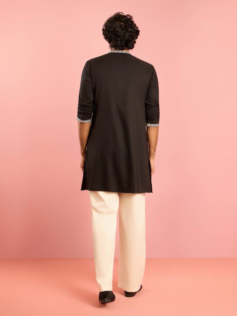 Black embroidered kurta palazzo set | thread work geometric design with cream wide leg bottom