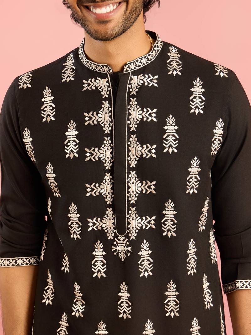 Product Name Black Embroidered Kurta Palazzo Set | Thread Work Geometric Design With Cream Wide Leg Bottom
