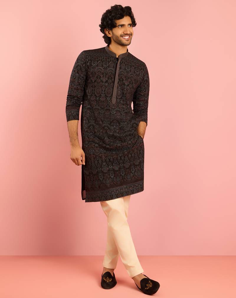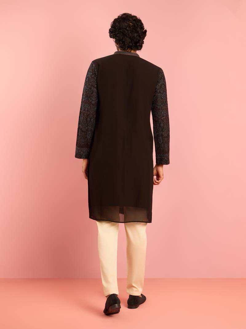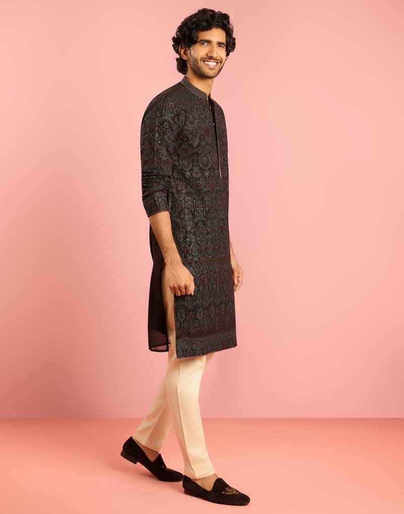 Make A Grand Festive Statement With This Luxurious Ethnic Ensemble From Vastramay. This Premium Bundle Pairs An Opulent Black Georgette Kurta Featuring Elaborate Kashmiri Style Thread Embroidery In Ethnic Motifs With A Beige Fine Satin Pyjama. The Kurta Showcases All Over Intricate Embroidery Work That Demonstrates Exceptional Craftsmanship, Enhanced By Decorative Detailing On The Collar And Placket. Designed With Mandarin Collar, Concealed Placket, And Knee Length Straight Silhouette With Side Slits, It Includes Full Crepe Lining For Comfortable Wear And Refined Draping. The Beige Fine Satin Pyjama Complements The Richly Embroidered Kurta With Its Elegant Simplicity, Featuring Elasticated Drawstring Waistband And Inseam Pockets. Ideal For Weddings, Eid, Diwali Celebrations, Festive Glitz Events, Navratri, And Cultural Occasions Requiring Premium Ethnic Attire. Care Instructions: Dry Clean Only To Preserve Embroidery And Georgette Fabric.