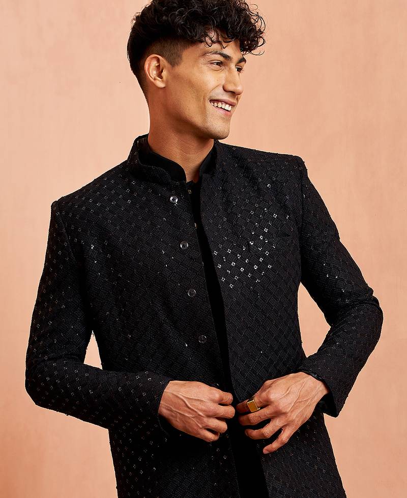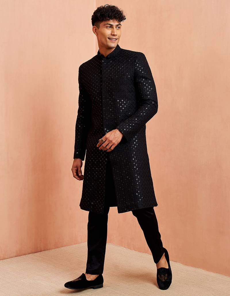 | Product Name | Black Sequin Chikankari Sherwani With Silk Kurta & Satin Pyjama | Premium 3 Piece Wedding Set | |