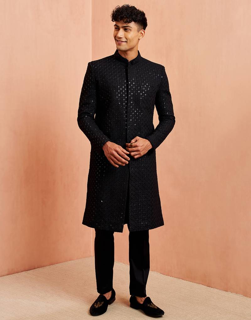 Black sequin chikankari sherwani with silk kurta & satin pyjama | premium 3-piece wedding set