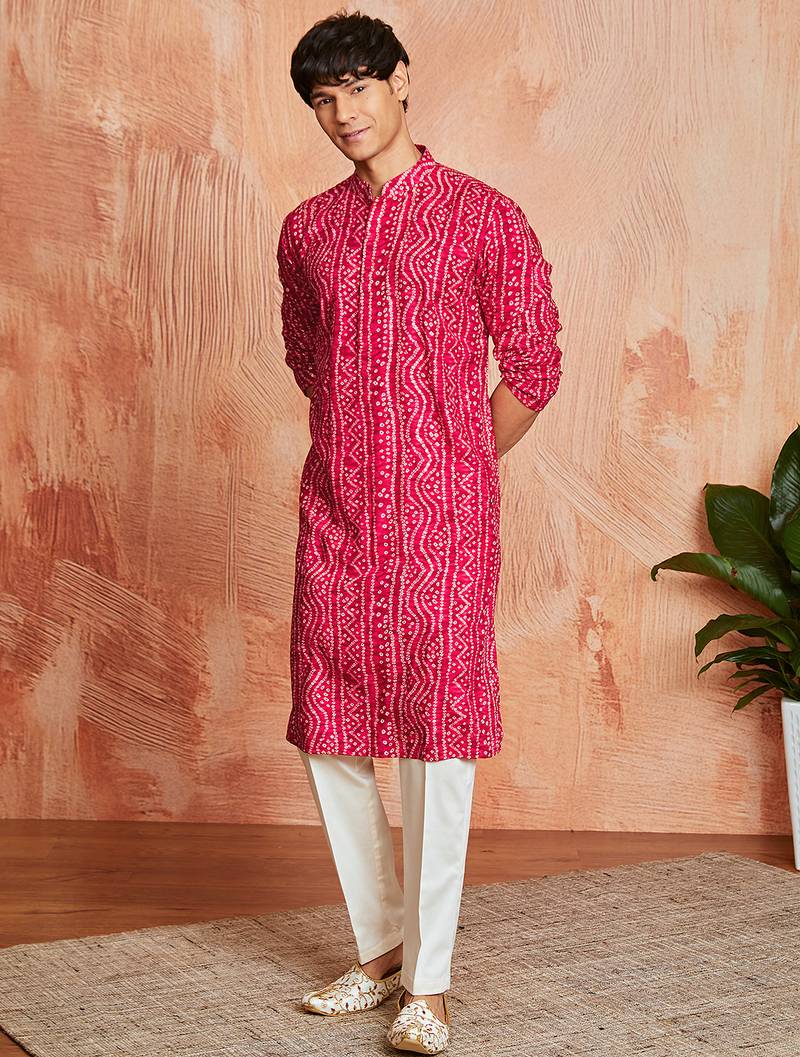 Stand Out With This Falsa And Cream Kurta Pyjama Set From Vastramay. The Falsa Rayon Kurta Is Adorned With An All Over Foil Bandhani Digital Print, Merging Traditional Bandhani Patterns With Contemporary Foil Accents For Eye Catching Ethnic Style. Designed With A Mandarin Collar, Concealed Button Placket, And Knee Length Straight Fit, The Kurta Features Full Sleeves, Side Slits, And 2 Inseam Pockets. The Cream Viscose Pyjama Offers Comfortable Contrast With Its Elasticated Drawstring Waistband. Made From Premium Rayon That Provides Breathability And Elegant Drape, This Set Combines Cultural Print Traditions With Modern Comfort. The Foil Detailing Creates Festive Shimmer While The Bandhani Pattern Adds Traditional Richness. Perfect For Casual Wear, Summer Occasions, Diwali, Navratri, Raksha Bandhan, And Everyday Casual Celebrations. The Vibrant Falsa Color Paired With Neutral Cream Creates Versatile Styling Options For Various Festive And Casual Settings. Care Instructions: Gentle Hand Wash Or Dry Clean To Maintain Foil Print Integrity And Fabric Quality.