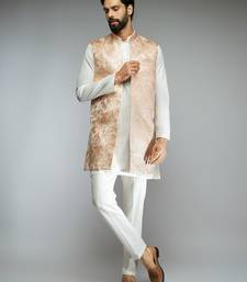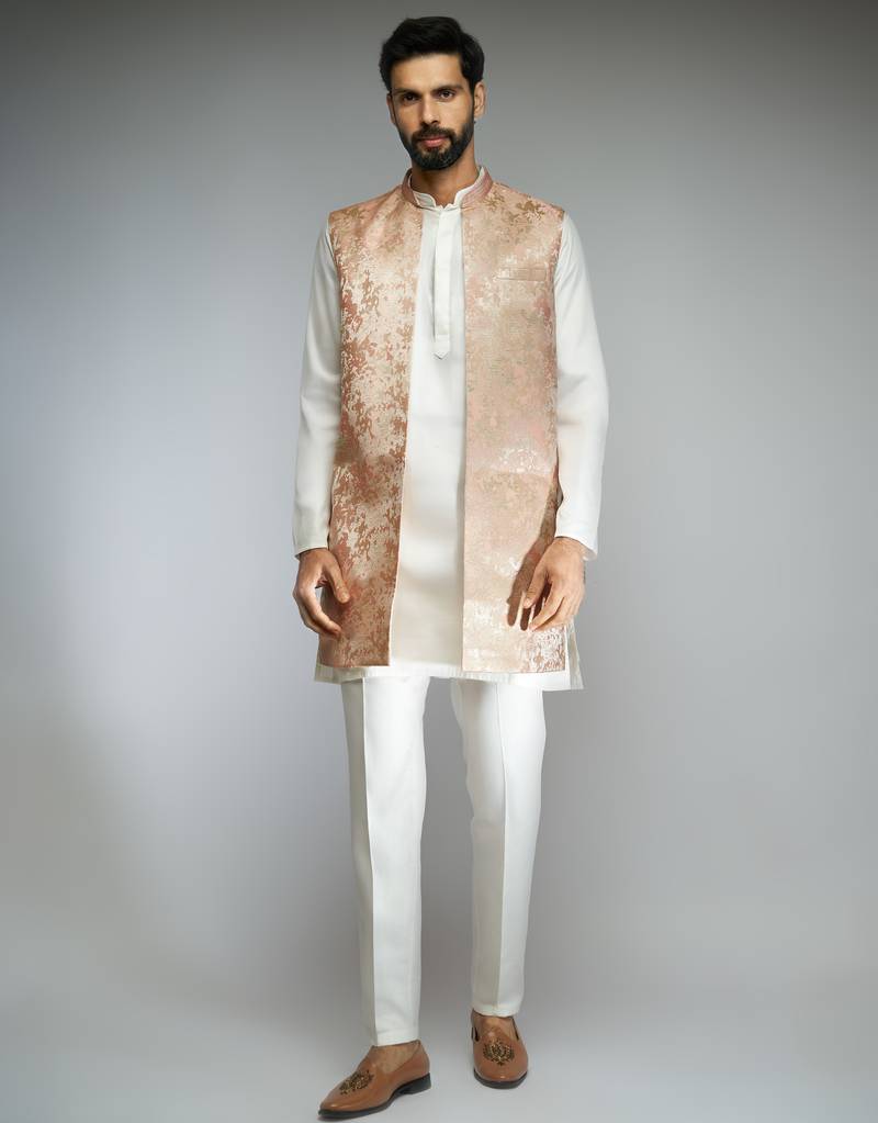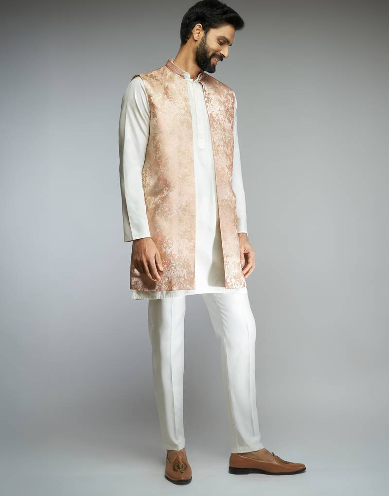 | Product Name | Peach Thread Embroidered Jacquard Weave Nehru Jacket With Cream Fine Satin Pant Style Pyjama Set | |