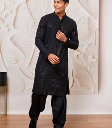 Mens black cotton kurta with viscose patiala set - festive ethnic wear with sequin embroidery