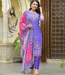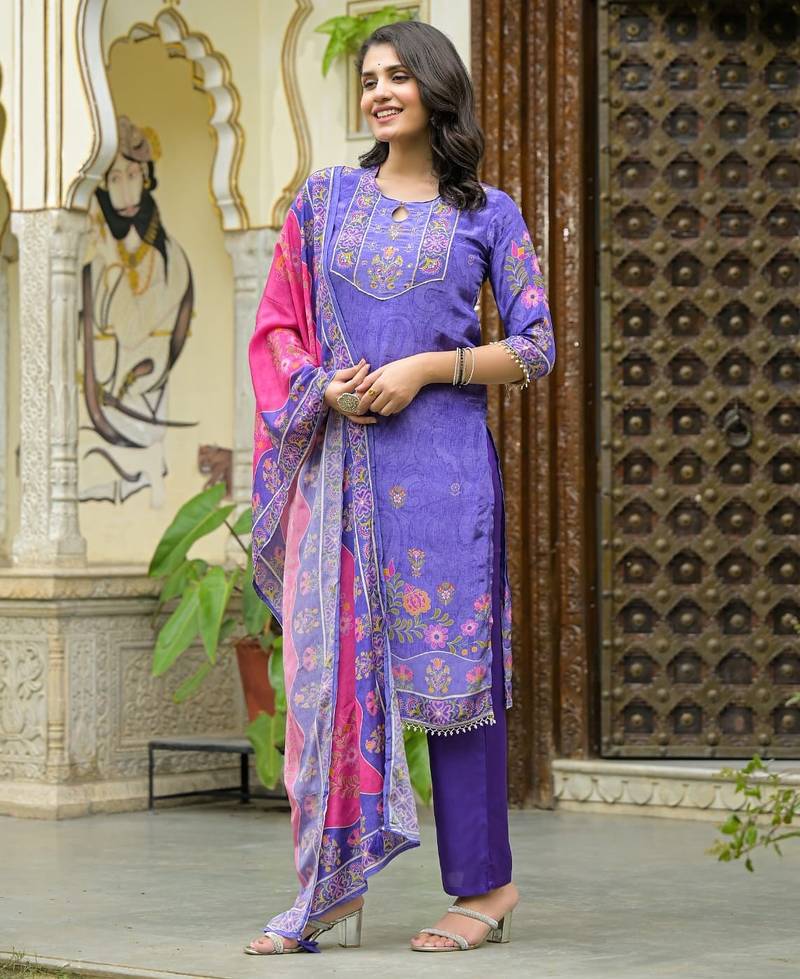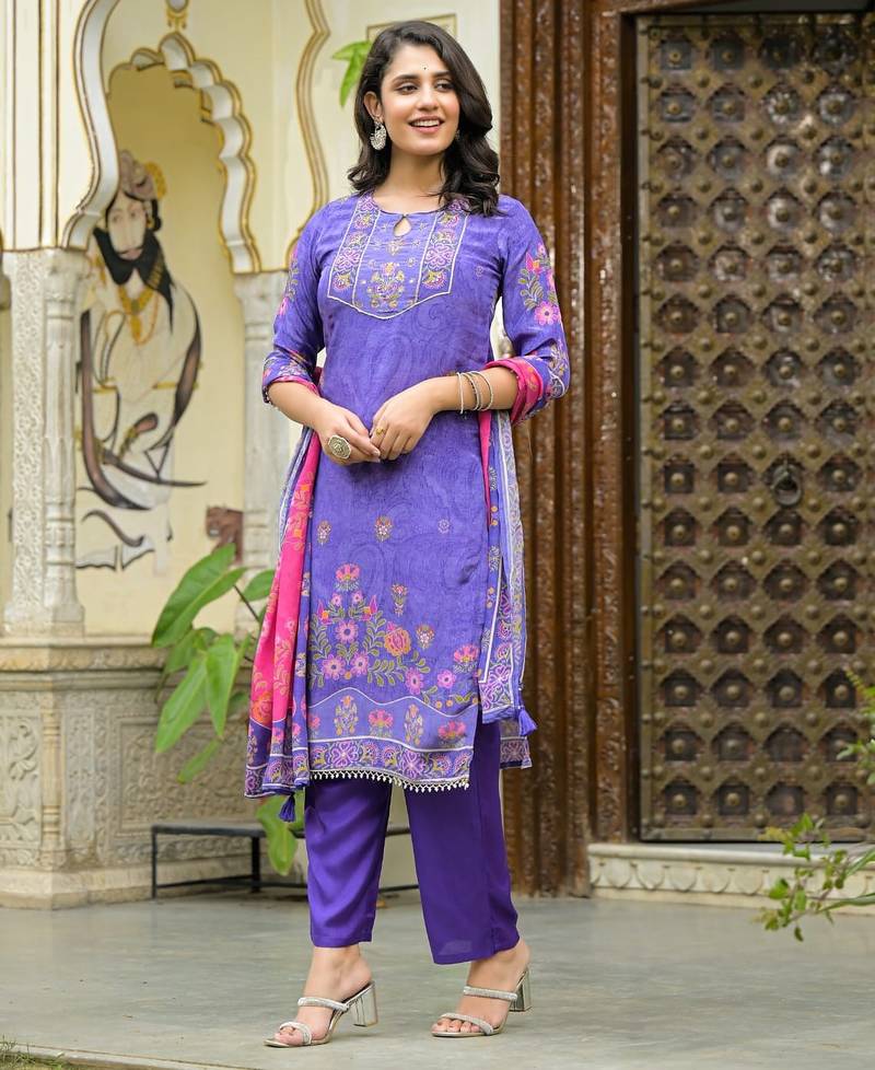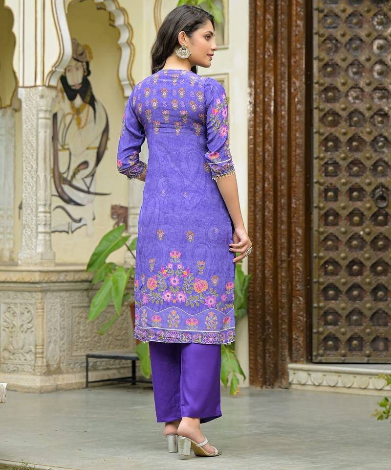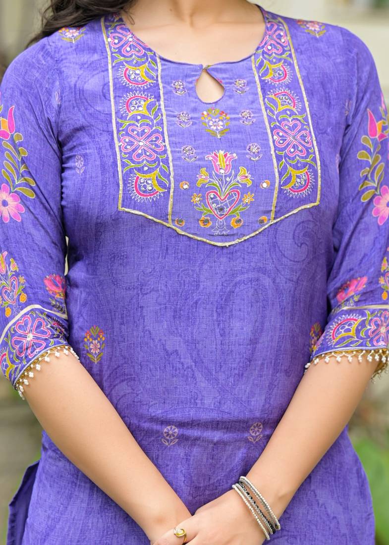 | Product Description | Lavender & Purple Color Printed Kurta With Trousers & Dupatta, Straight Calf Length Kurta & Straight Hem, Has A Keyhole Neck , Three Quarter Regular Slevees,