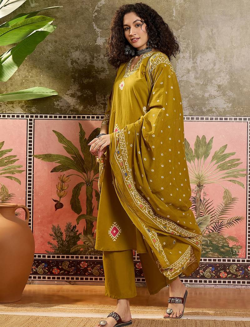 | Product Description | Mustard Straight Calf Length Kurta Has A V Neck Three Quarter Regular Slevees, Solid Trousers,Elasticated Waistband, Slip On Closure, Has A Pocket, Printed Dupatta, Has A Taping Border. |