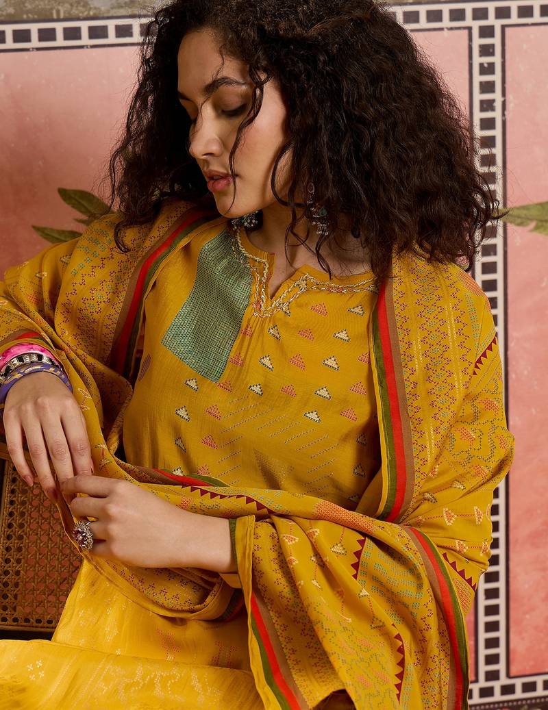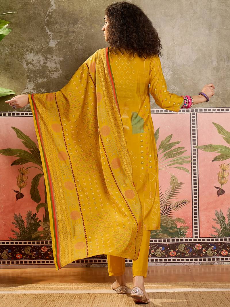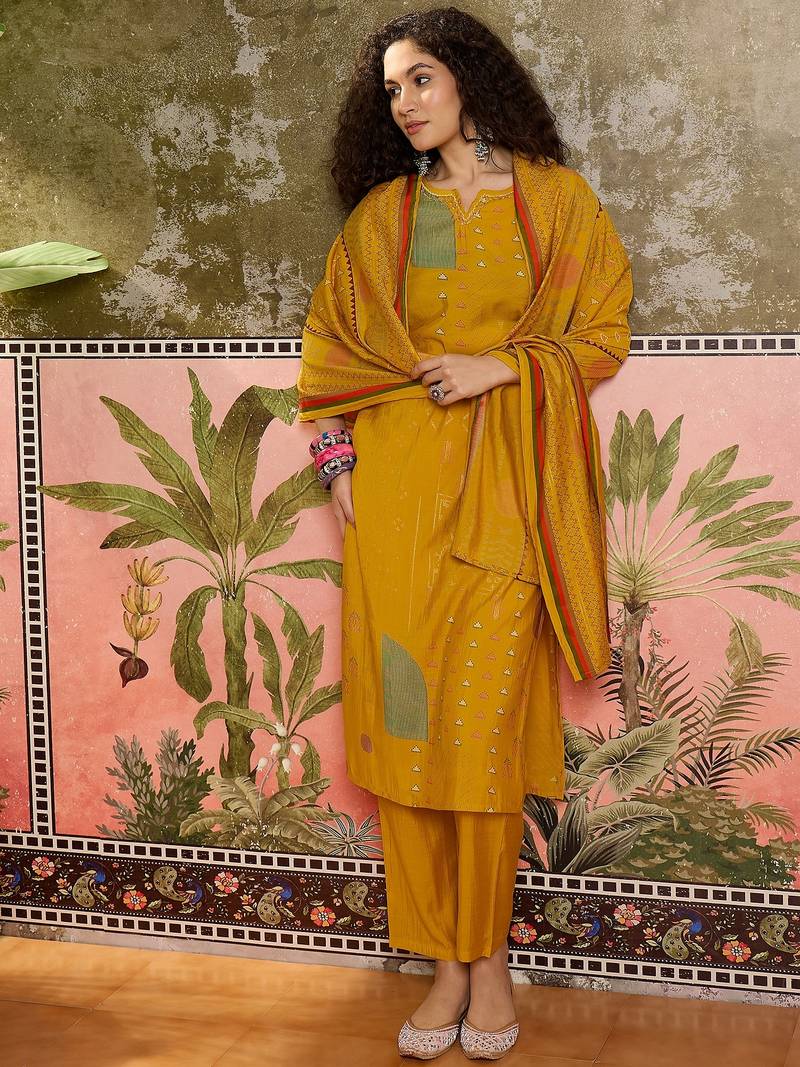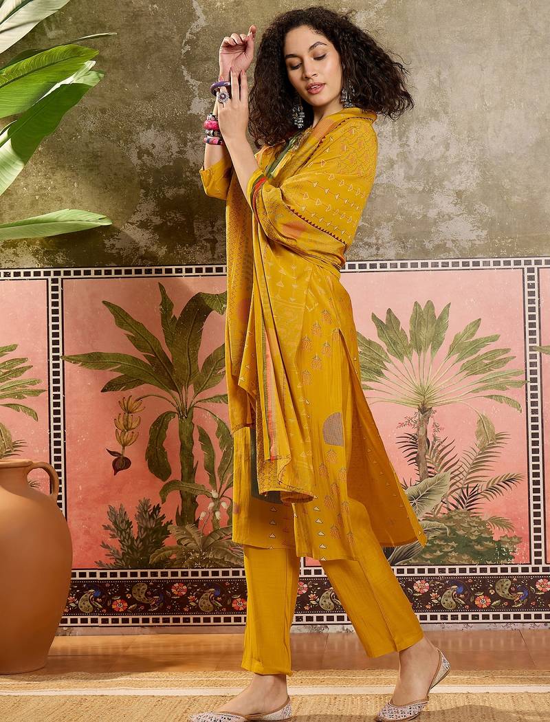 Product Name Mustard Printed Kurta With Trousers & Dupatta Set