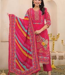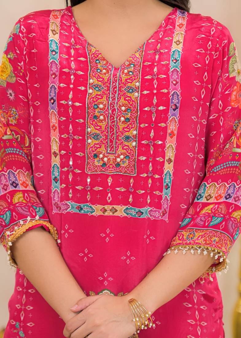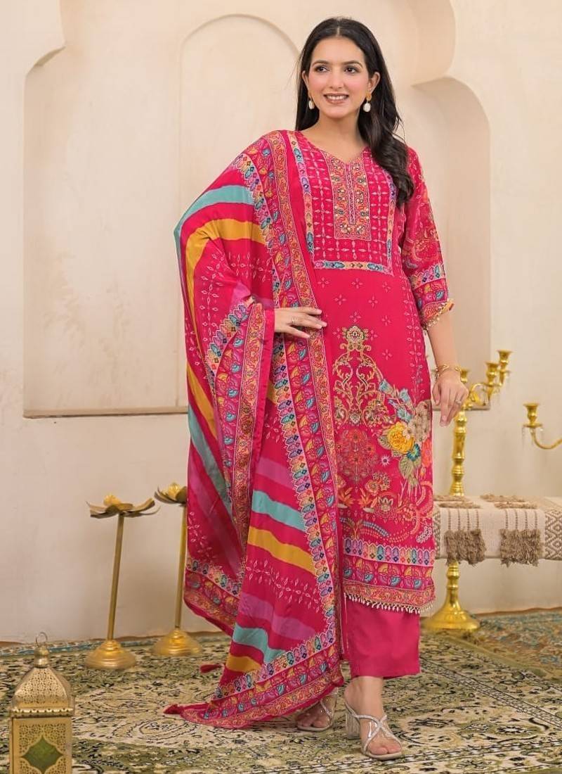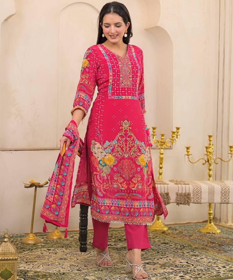 | Product Description | Pink Color Printed Kurta With Trousers & Dupatta, Straight Calf Length Kurta & Straight Hem, Has A V Neck, Three Quarter Regular Slevees,