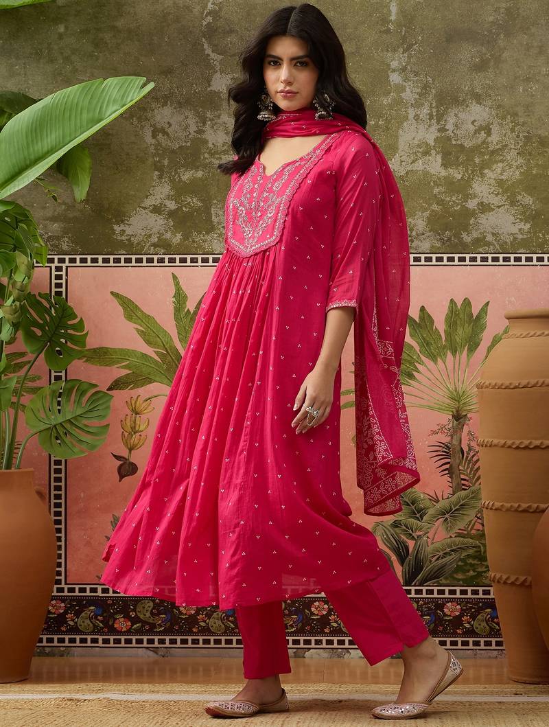 | Product Description | Pink Embroidered A Line Kurta With Trousers & Dupatta, Straight Calf Length Kurta & Straight Hem, Has A Round Neck, Three Quarter Regular Slevees, Solid Trousers Elasticated Waistband, Drawstring Closure, Has A Pocket, Printed Dupatta, Has A Taping Border. |