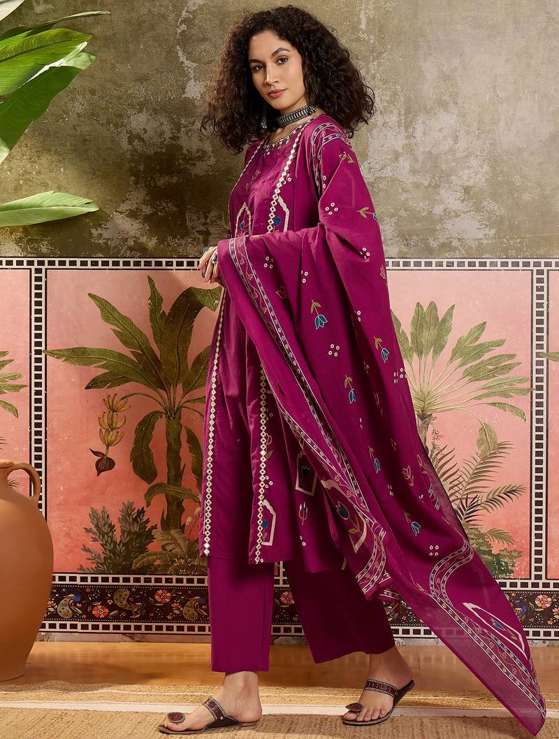 | Product Description | Wine A Line Calf Length Kurta Has A Round Neck Three Quarter Regular Slevees, Solid Trousers,Elasticated Waistband, Slip On Closure, Has A Pocket, Printed Dupatta, Has A Taping Border. |