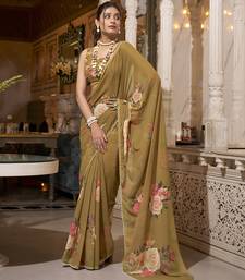Brown spectacular georgette printed with pearl lace saree with unstitched blouse