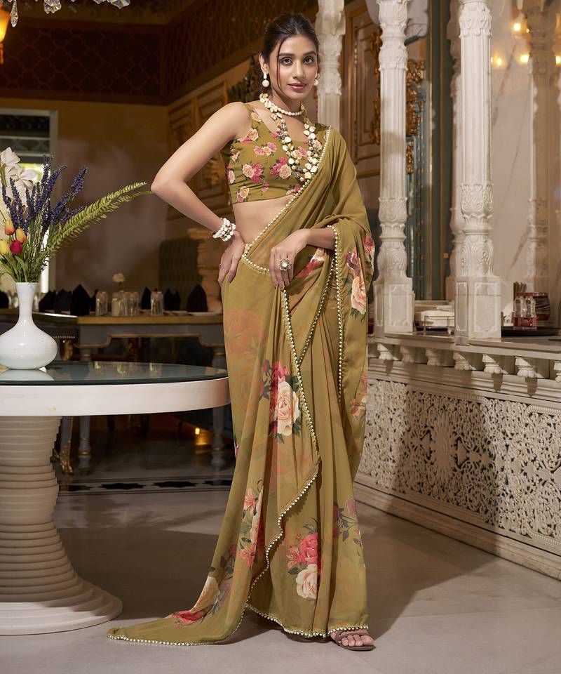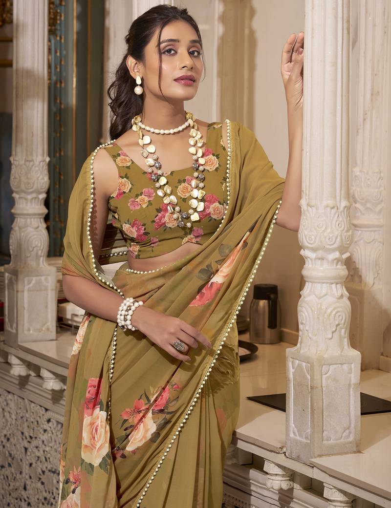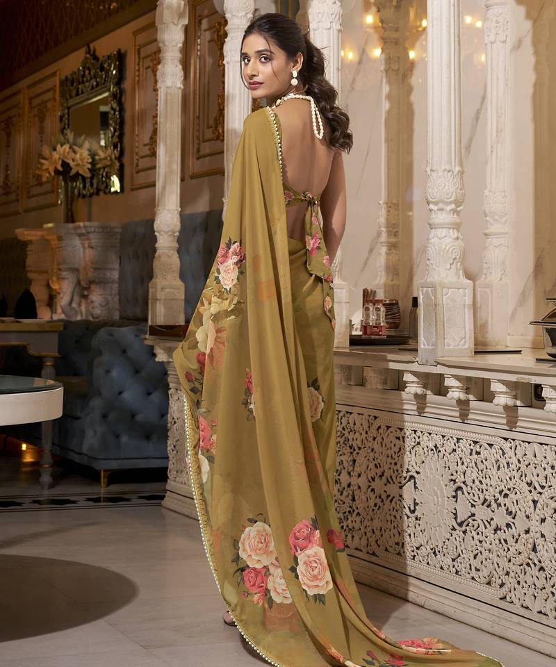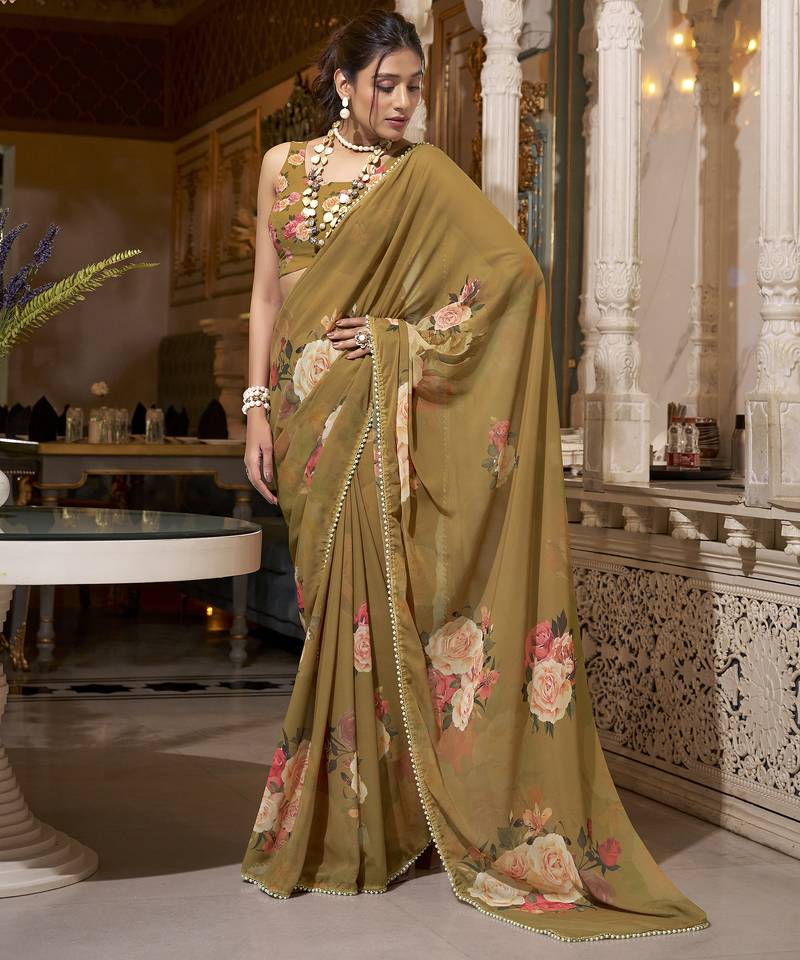 | Product Name | Brown Spectacular Georgette Printed With Pearl Lace Saree With Unstitched Blouse | |
