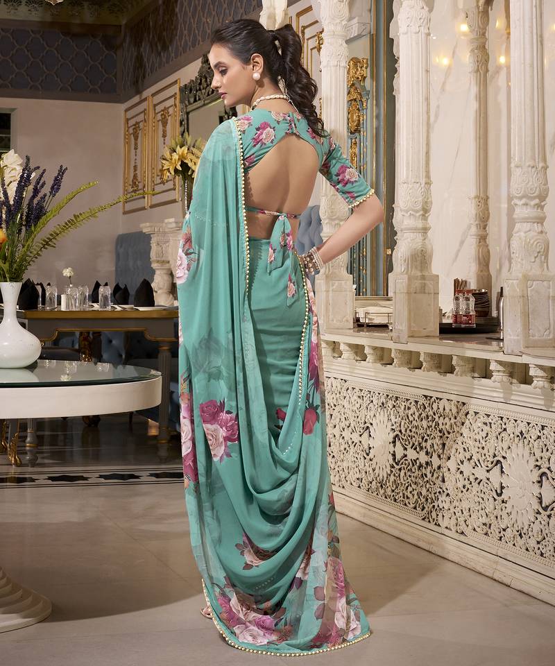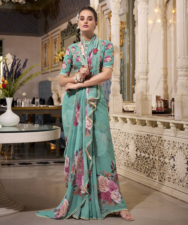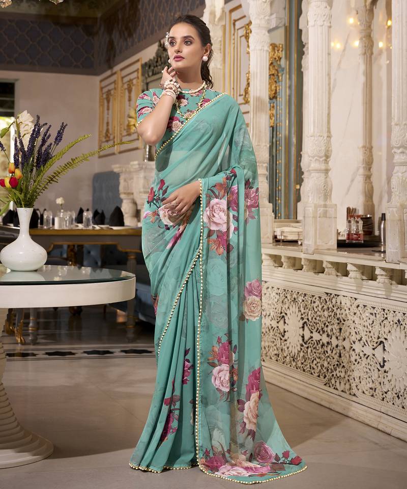 | Product Name | Green Spectacular Georgette Printed With Pearl Lace Saree With Unstitched Blouse | |