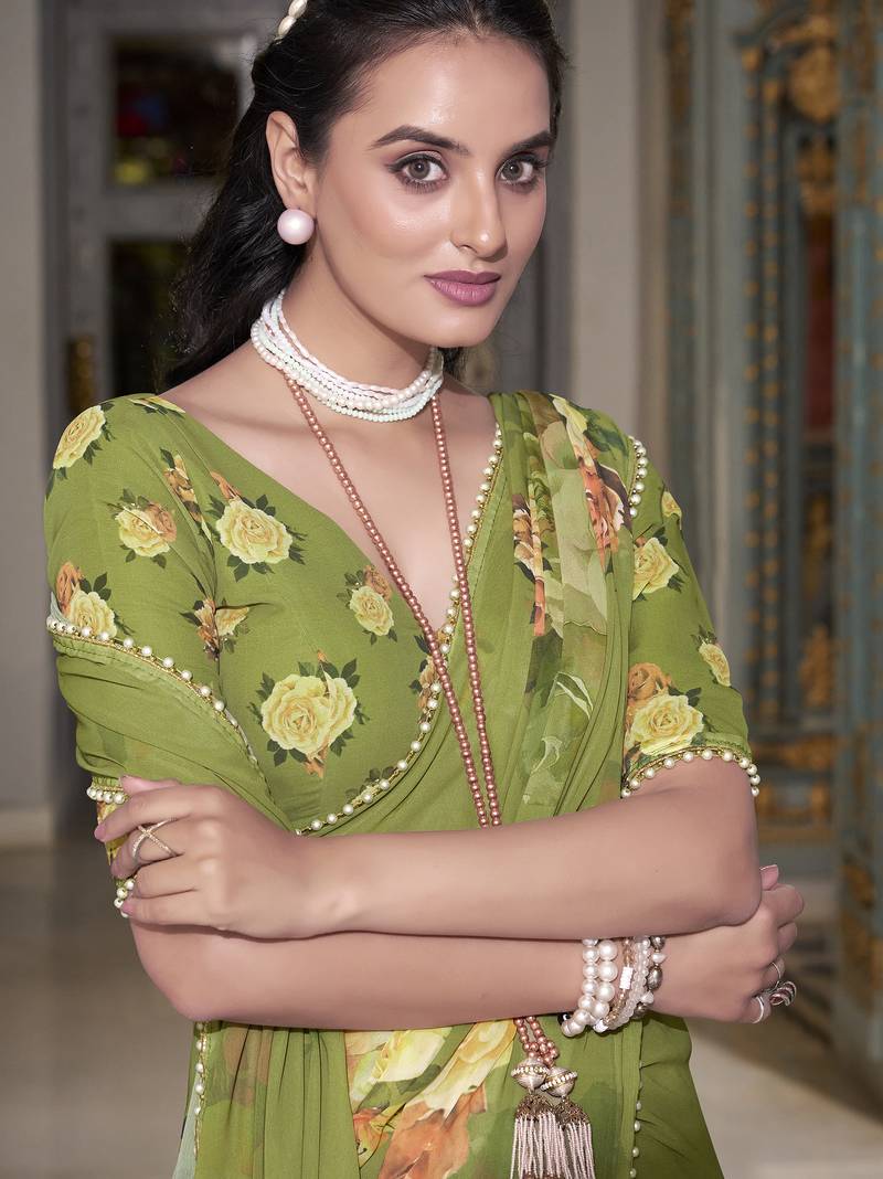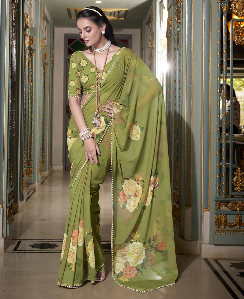 Product Name Mehendi Spectacular Georgette Printed With Pearl Lace Saree With Unstitched Blouse
