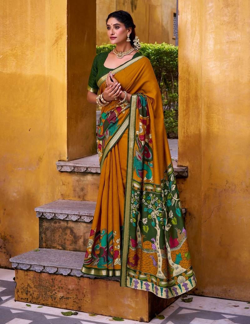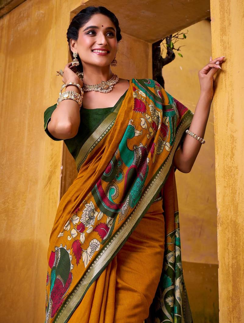 Mustard viscose chanderi kalamkari print with zari working saree & unstitched blouse