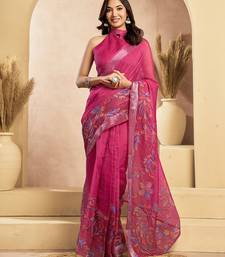 Pink digital printed linen ready to wear designer saree with unstitched blouse